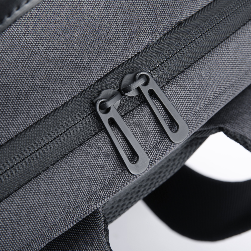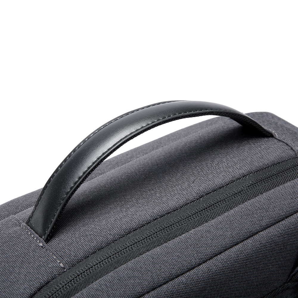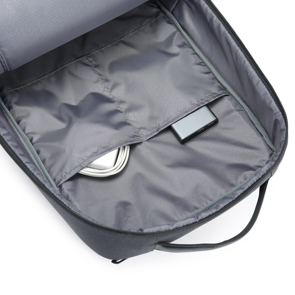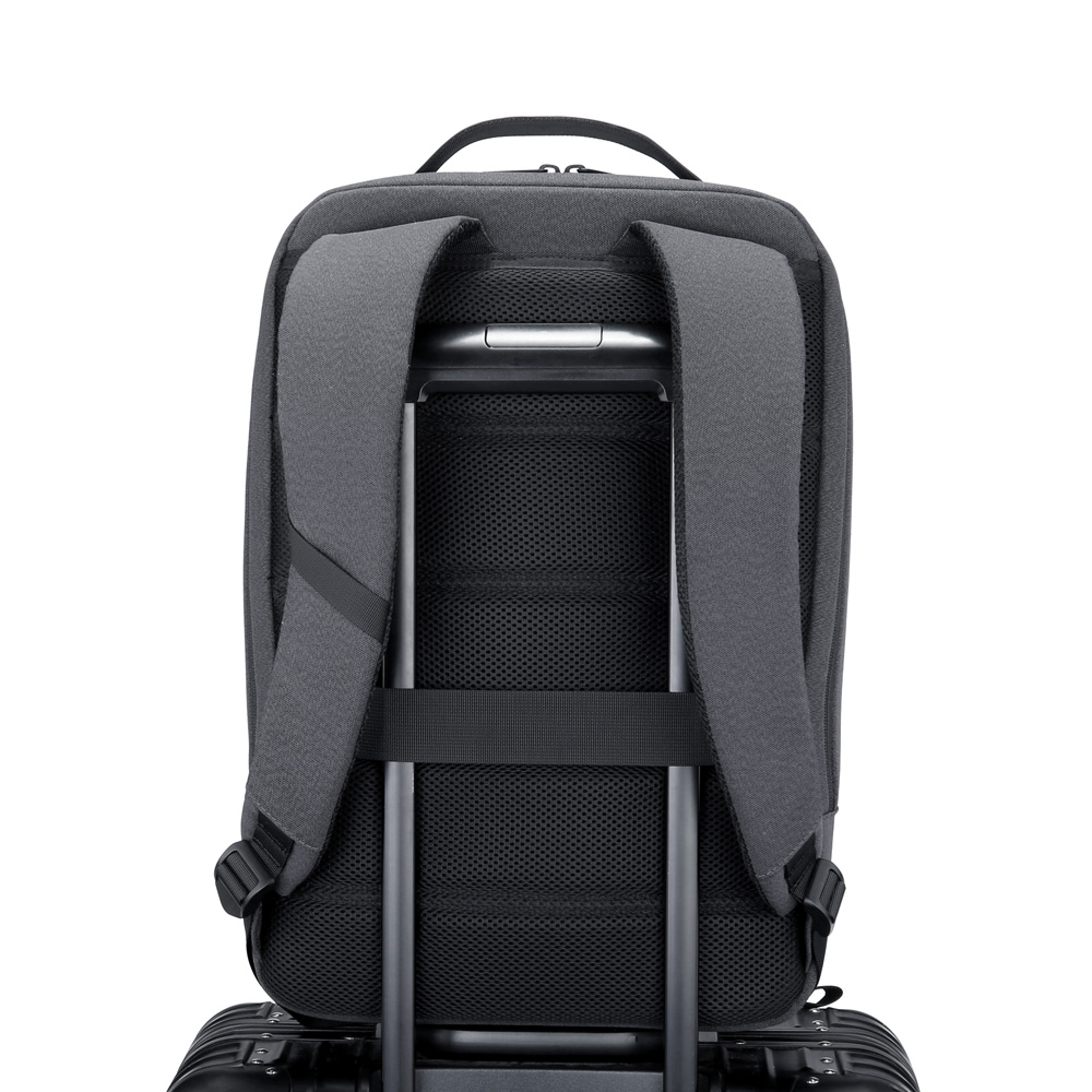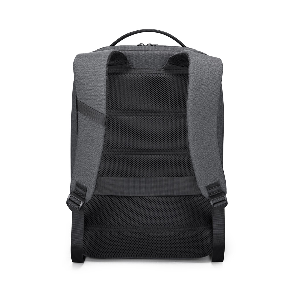 Mochila premium, produzida com poliéster acolchoado, alças de ombro acolchoadas, interior com divisórias com zíper para acomodar pequenos objetos, bolso frontal com zíper e na parte das costas uma divisória atrás, com engate para mala de viagem, aceita notebook de até 15,6”, porta USB na lateral.