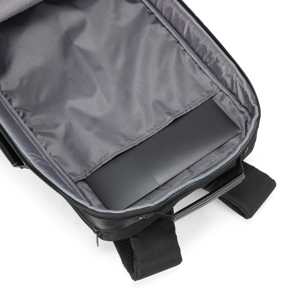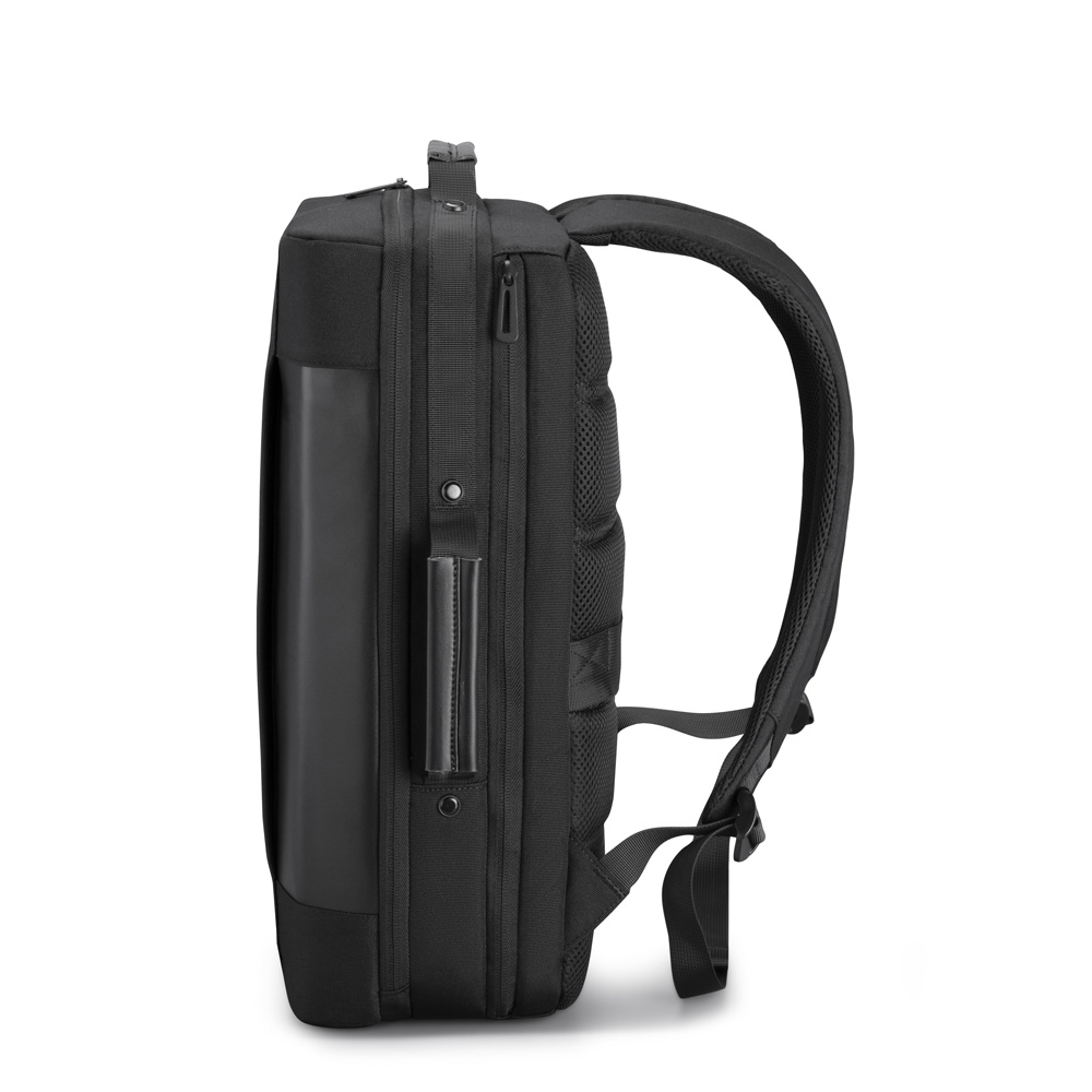 Mochila premium, produzida com poliéster acolchoado, alças de ombro acolchoadas, interior com divisórias, bolso frontal com zíper e na parte das costas uma divisória atrás do engate para mala de viagem, aceita notebook de até 15,6”.