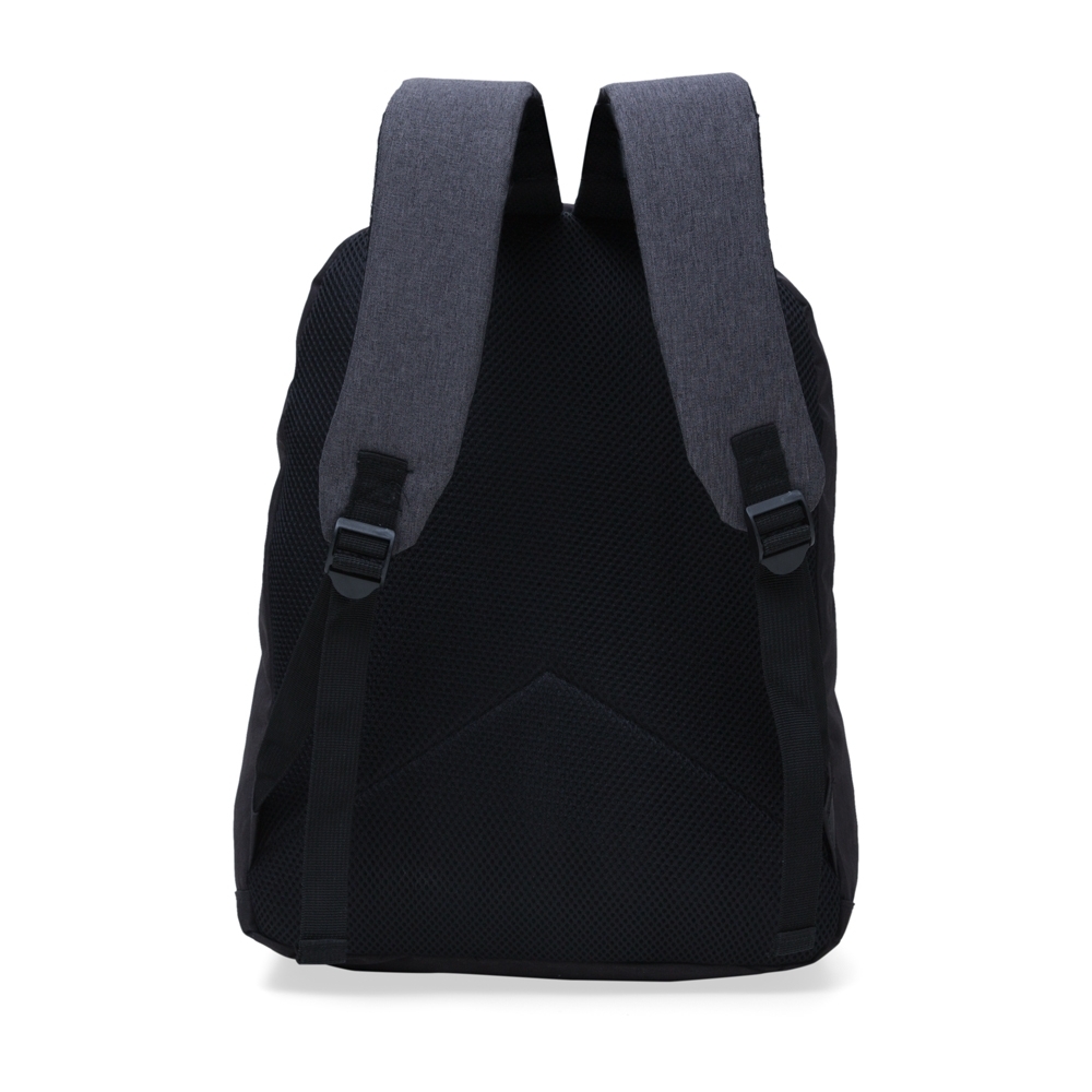 Mochila nylon poliester para notebook preta com detalhes em cinza. Possui compartimento grande com bolso interno para notebook e bolso frontal. Zíperes prata, alça superior de nylon, alças para costa ajustáveis, parte traseira revestida de espuma para maior conforto. Acompanha plaquinha para personalização na área frontal.