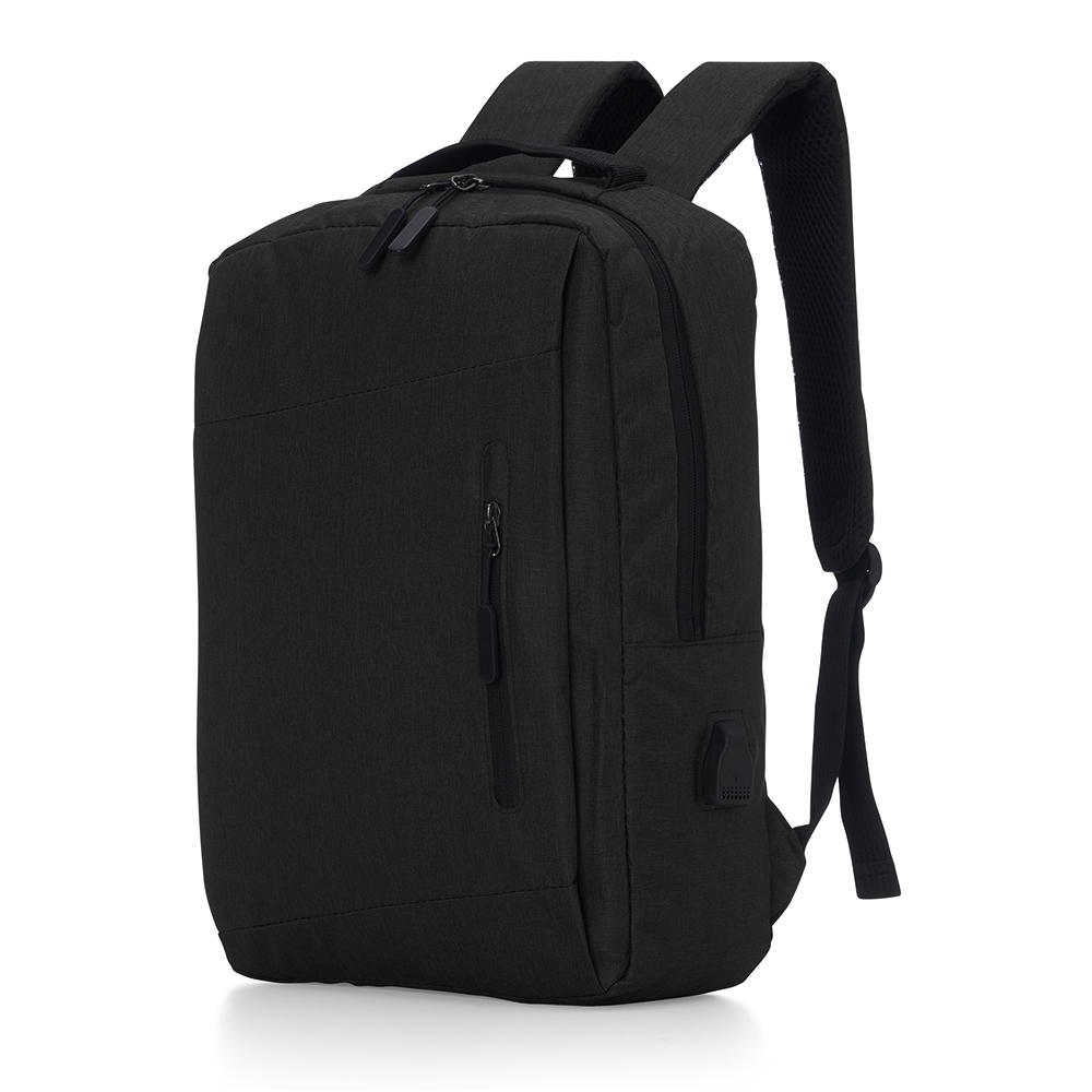 Mochila confeccionada em nylon com compartimento para notebook até 15,6 polegadas. Contém compartimento grande com divisórias para documentos, eletrônicos e caneta, dois compartimentos frontais com abertura vertical, bolso lateral e adaptador USB externo com cabo acoplado, permitindo a conexão de um carregador portátil de dentro da mochila e transferência da carga para o lado externo, ocultando o carregador e viabilizando a utilização do celular durante o processo. Contém zíperes com pegadores plásticos, alça de mão em nylon e alças para as costas ajustáveis com revestimento espumado antitranspirante.