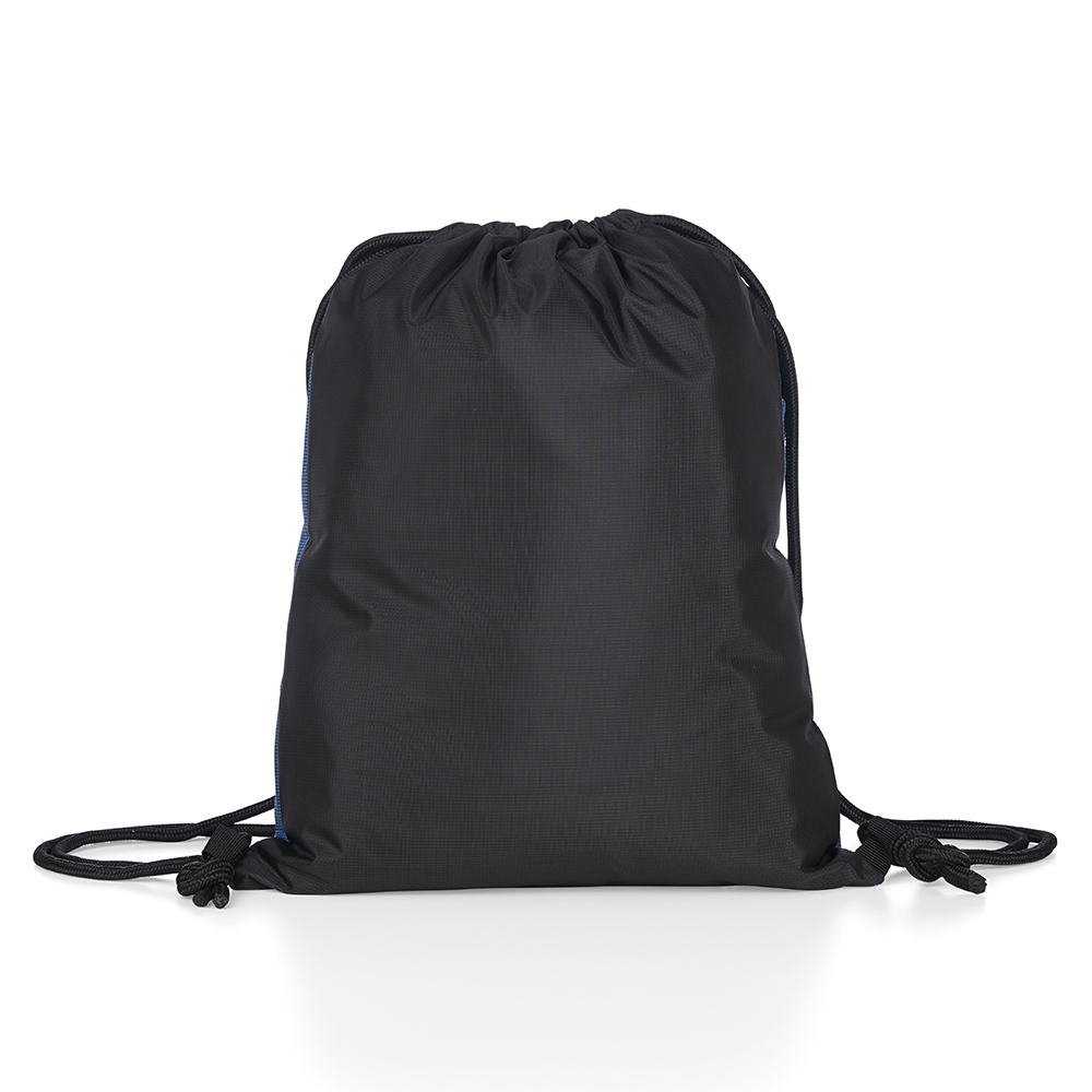 Mochila saco impermeável em fibra de poliéster. Contém bolso horizontal com zíper na parte frontal e alças de nylon.