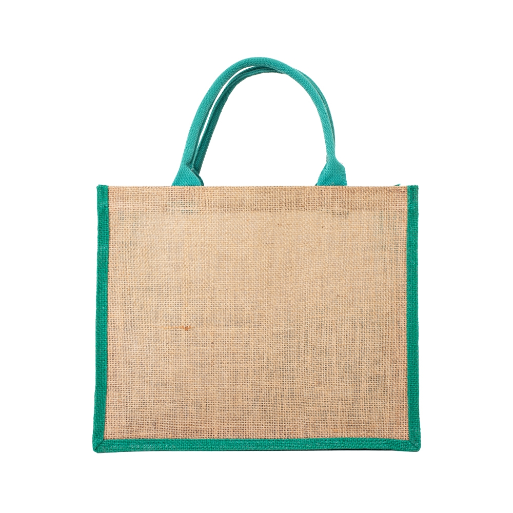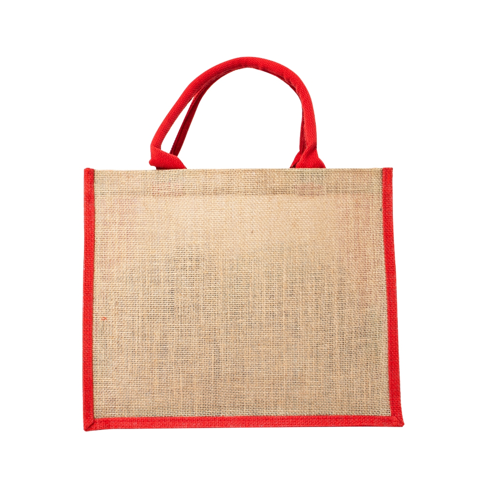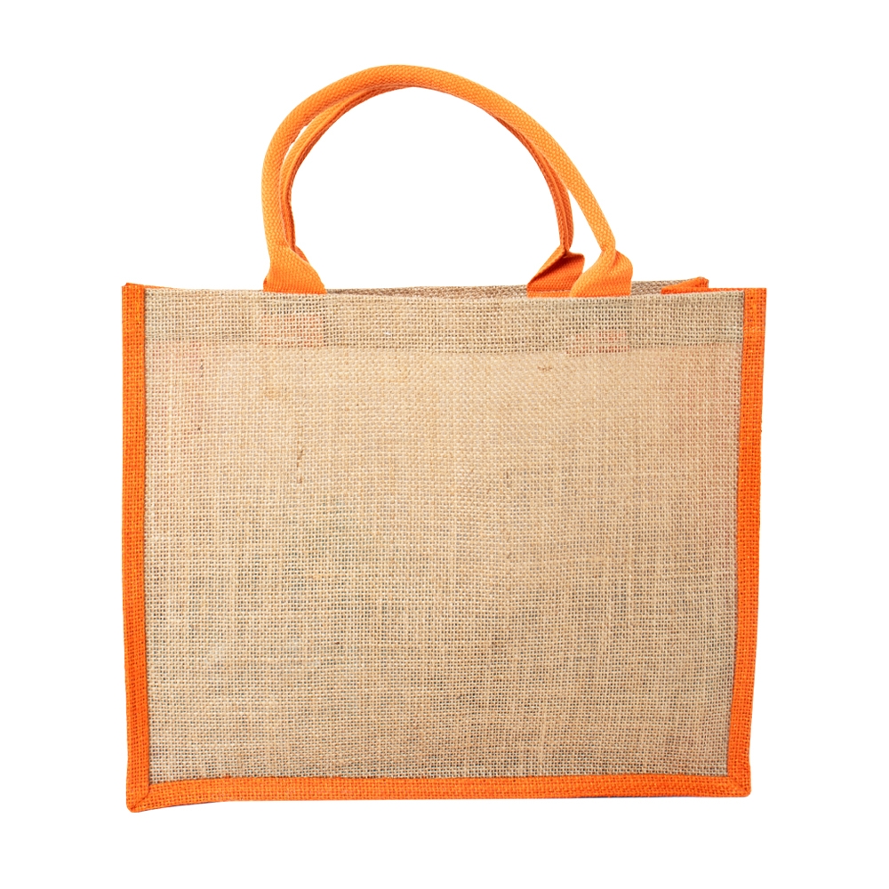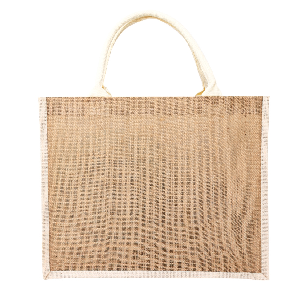 Sacola ecológica confeccionada em juta com alças costuradas na parte interna.