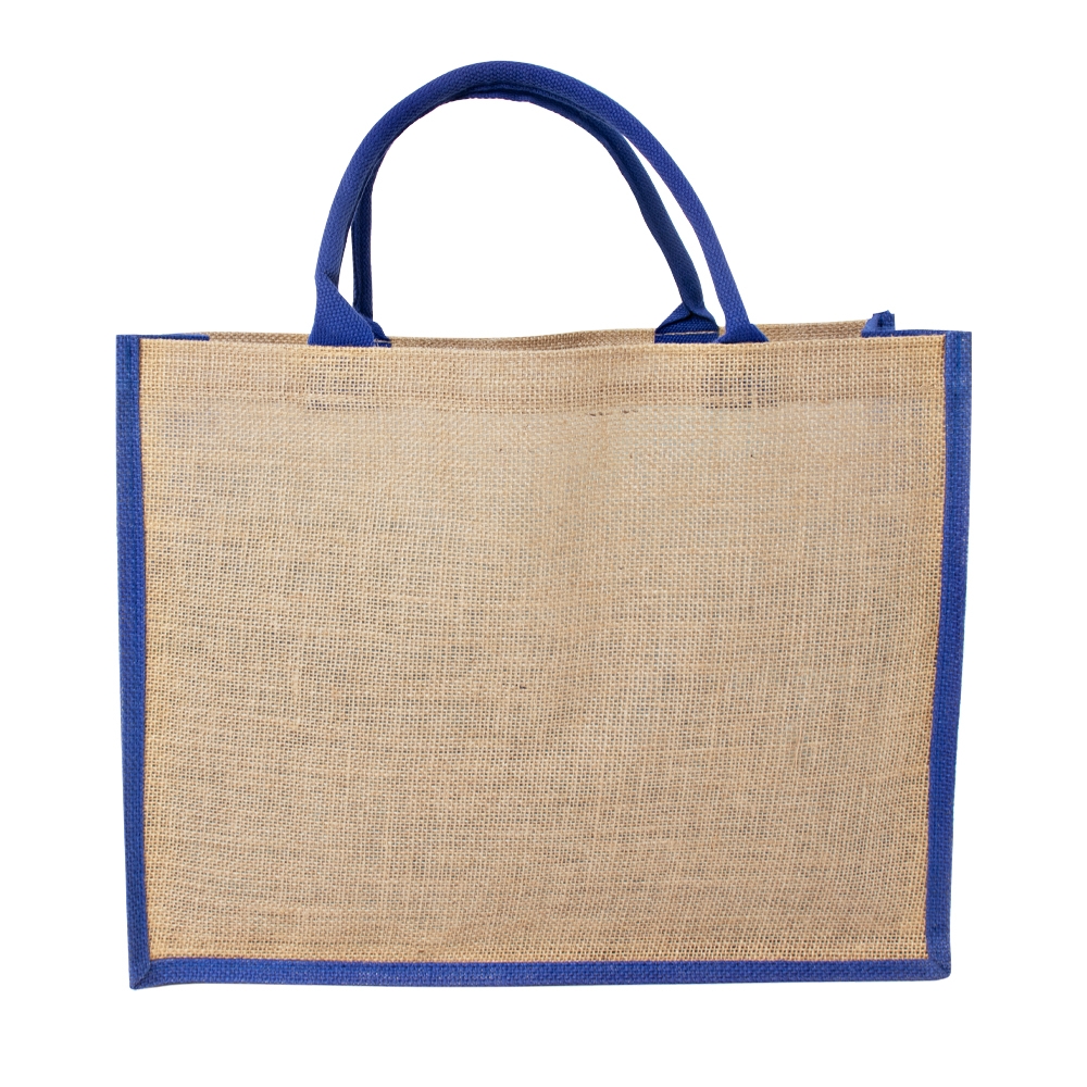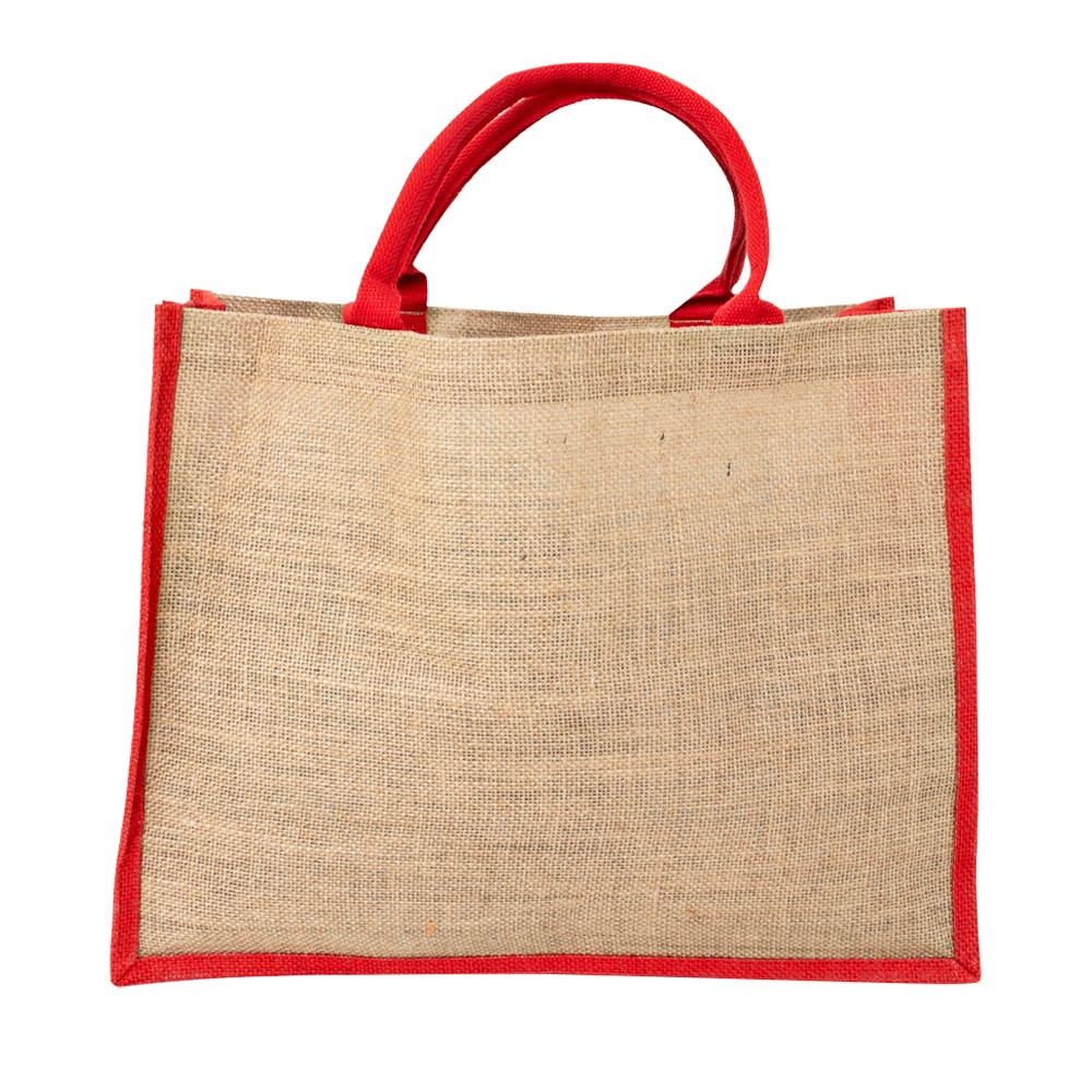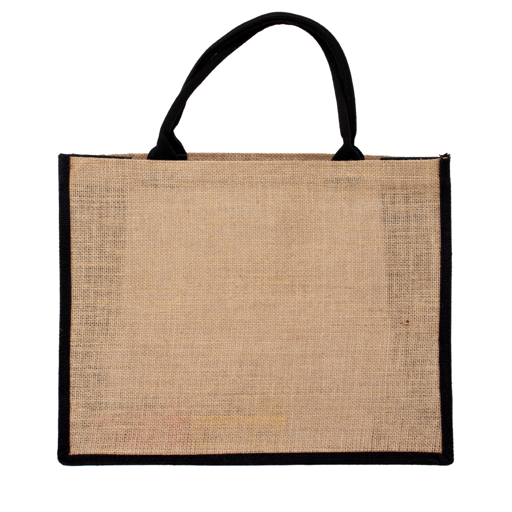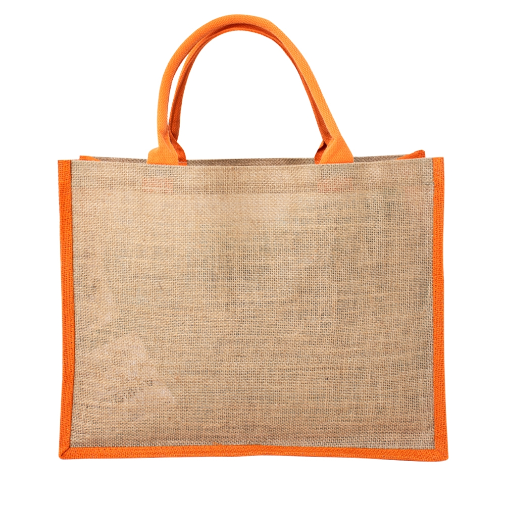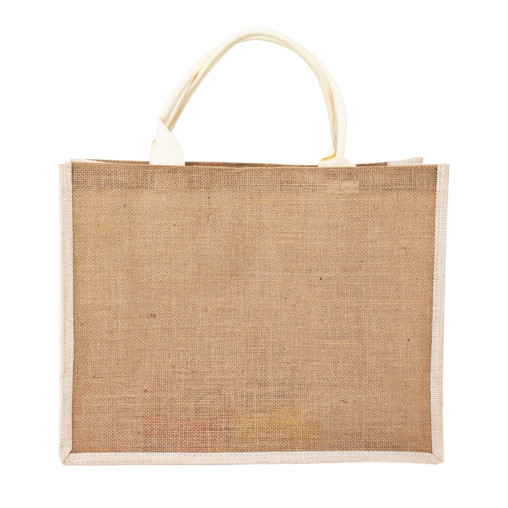 Sacola ecológica confeccionada em juta com alças costuradas na parte interna.