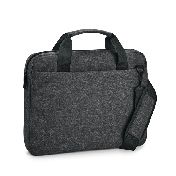 Pasta para notebook. 600D de alta densidade. Compartimento para notebook 14''. Interior forrado e almofadado. Com bolso frontal. Com alça de ombro e alça para transporte em trolley. 370 x 280 x 50 mm