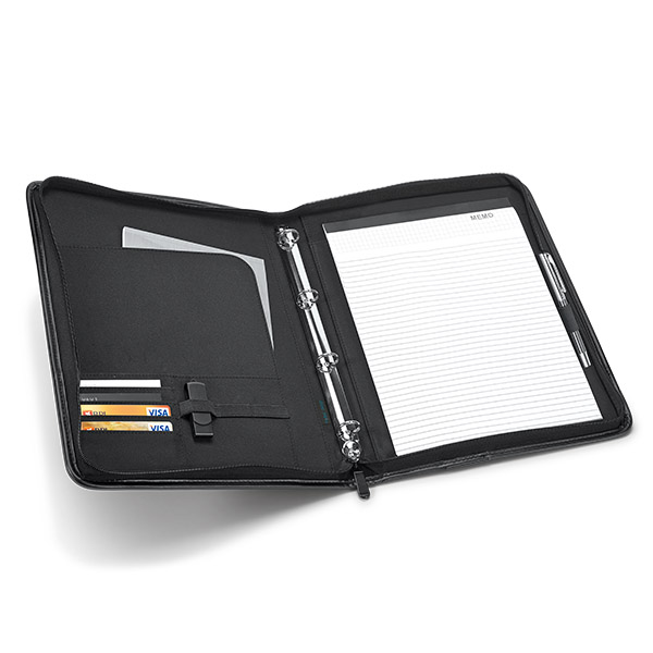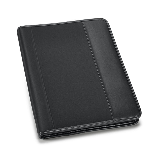 Pasta A4. C. sintético e microfibra. Com 4 argolas de 20 mm para folhas A4. Bloco: 20 folhas pautadas. Pen drive não inclusa. 265 x 340 x 45 mm