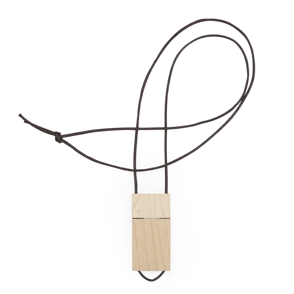 Descrição: Pen drive de madeira no formato retangular suspenso a um cordão.