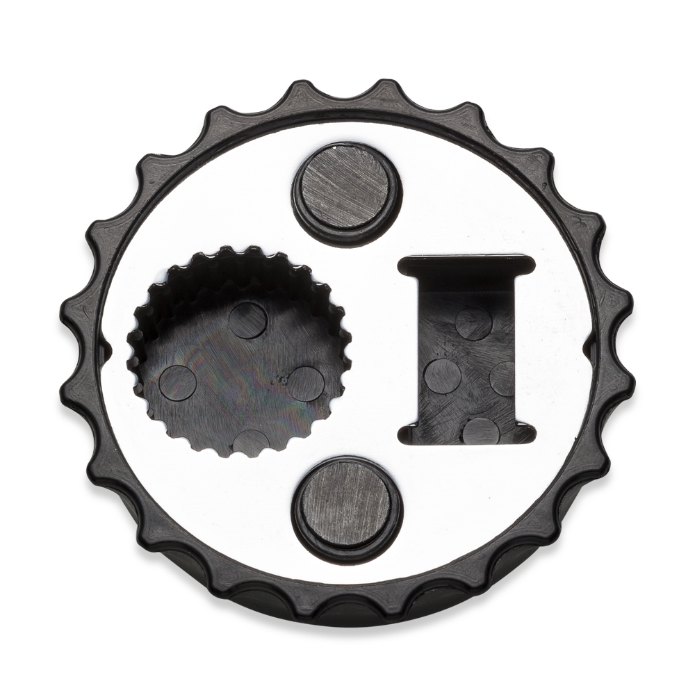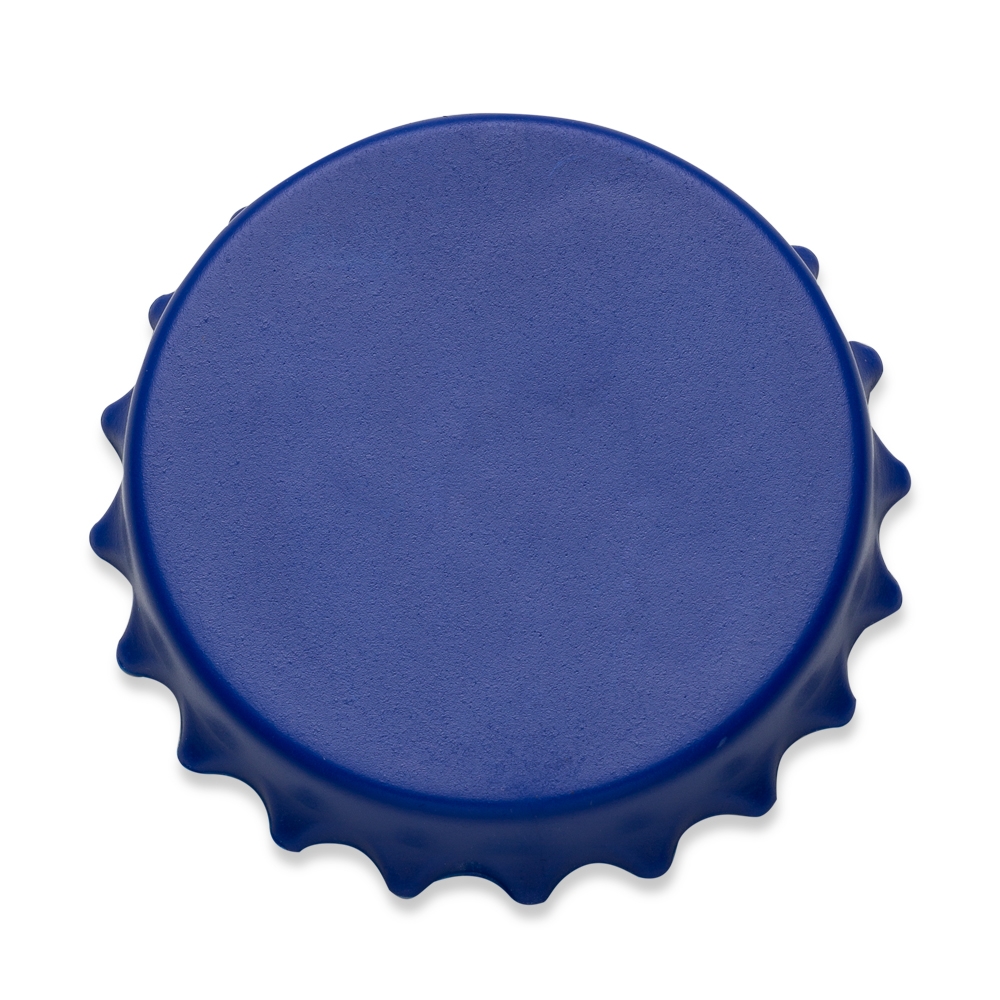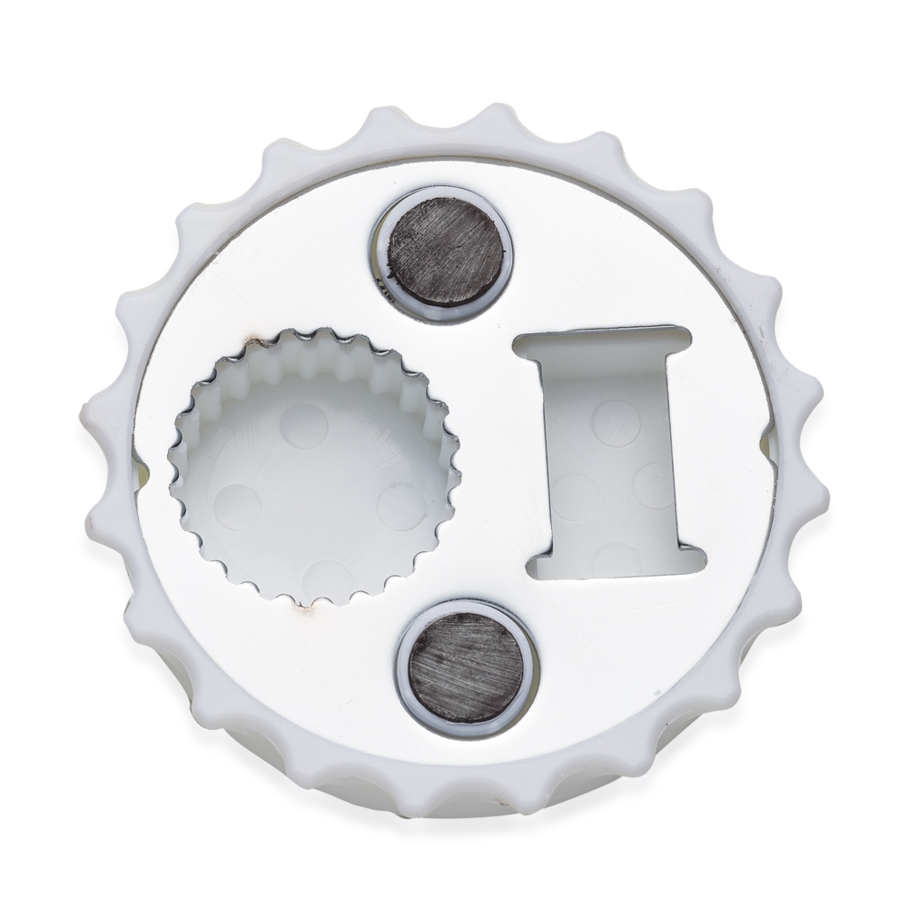 Abridor de garrafa formato tampa, material plástico resistente com imã de geladeira. Parte traseira possui compartimento metálico que pode abrir tampa de garrafa pet comum e também abrir tampas de metal.