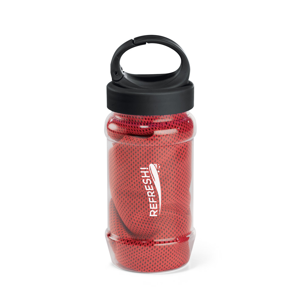 Kit toalha e garrafa. Toalha para esporte em poliamida e poliéster. Toalha refrescante, quando molhada permanece fria durante horas. Se aquecer, basta balançar reativando sua frescura. Reutilizável e lavável à máquina. Garrafa em PP e PET com mosquetão incluso (food grade). Capacidade até 440 ml. Toalha: 300 x 800 mm | Garrafa: ø65 x 183 mm