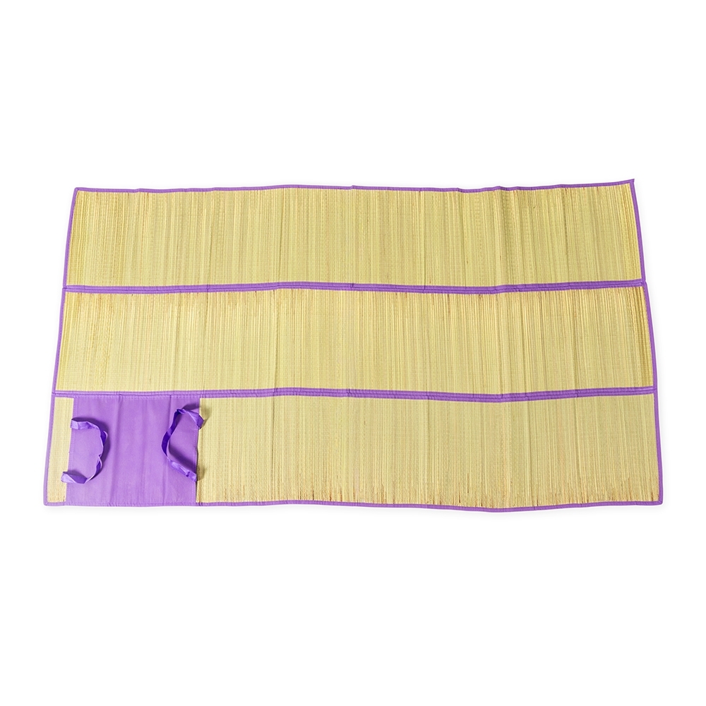 Descrição: Esteira dobrável em palha sintética com bordas costuradas em nylon dividindo a esteira em três partes. Além disso, possui um par de alças costuradas para transporte.
