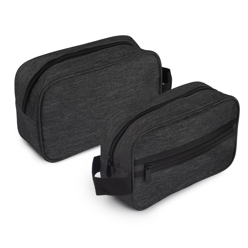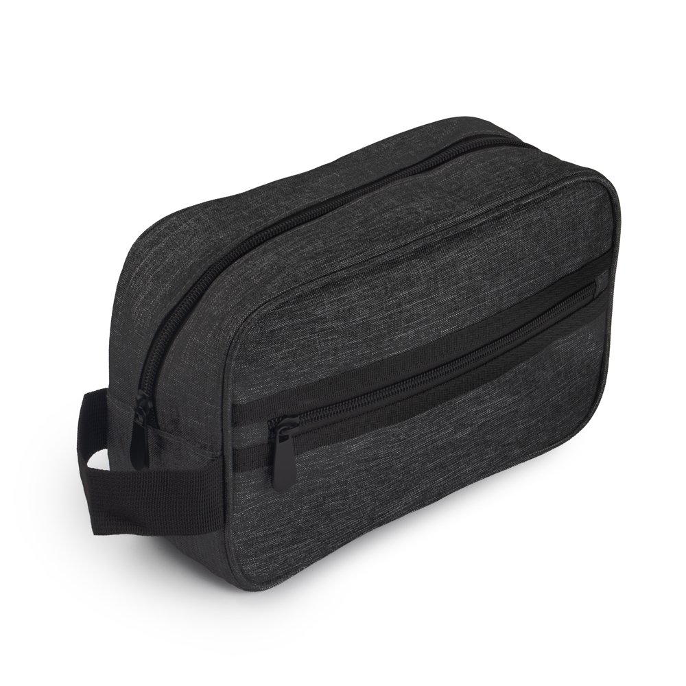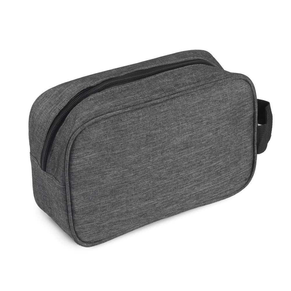 Necessarie em tecido poliéster, alça de mão e bolso externo com zíper.