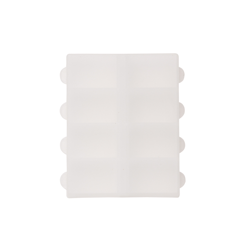 Porta comprimidos semanal de plástico branco fosco. Possui oito divisórias, sete delas escrito em relevo os dias da semana e a última escrito "reserva". Verso liso.
