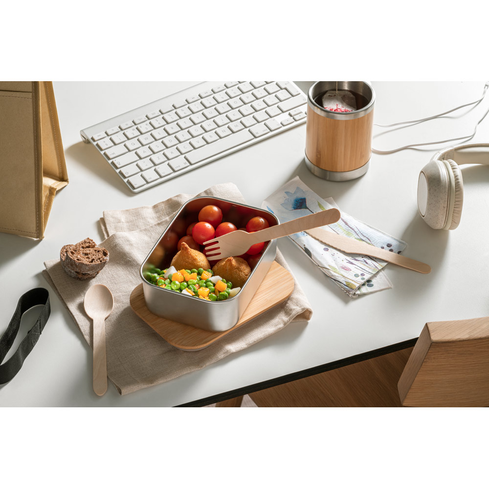 Marmita em aço inox e tampa em bambu com banda elástica para um transporte mais seguro. Capacidade até 800 ml. Food grade. Fornecida em caixa de papel craft. 165 x 115 x 52 mm