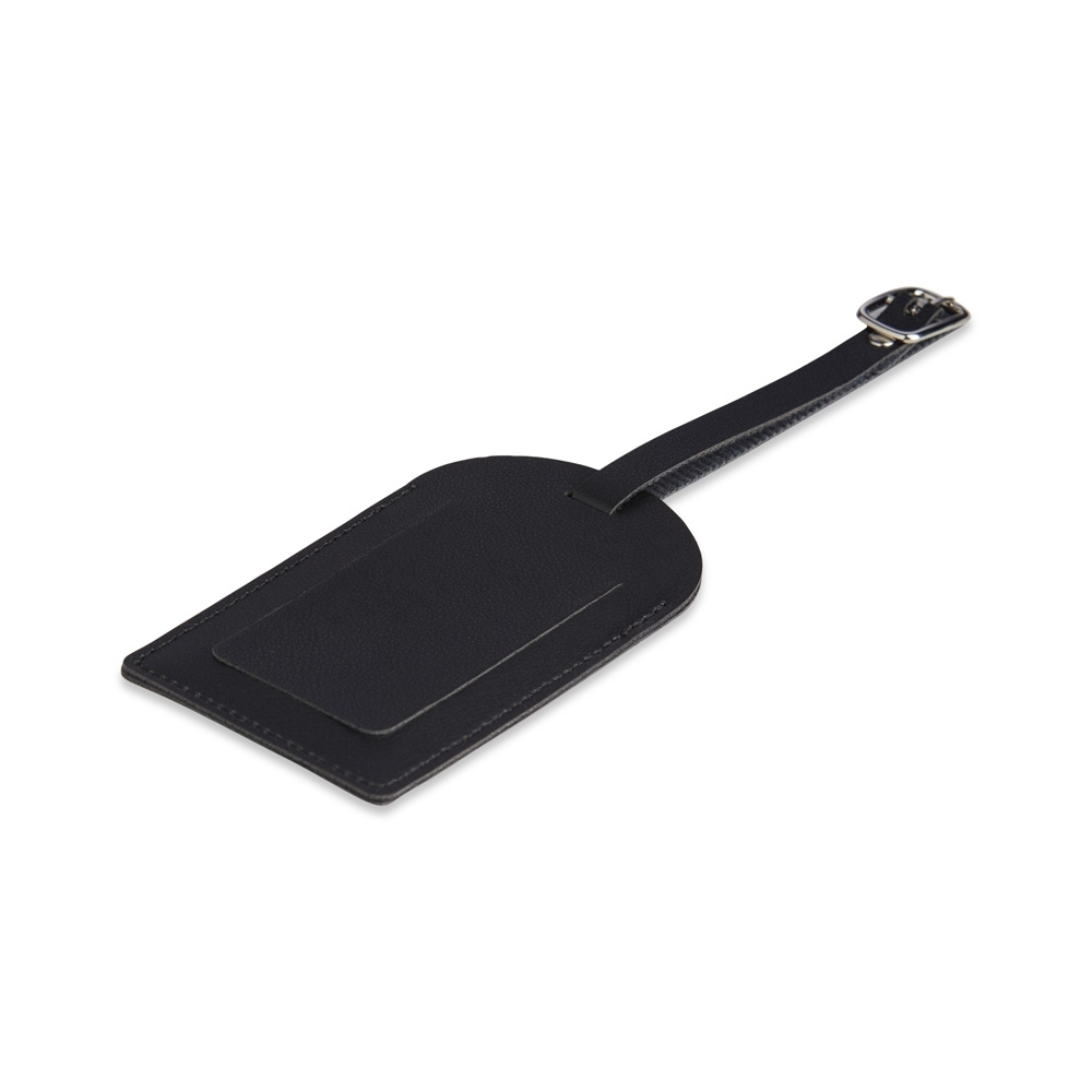 Descrição: Tag identificador de bagagem em material sintético (imitação de couro).
