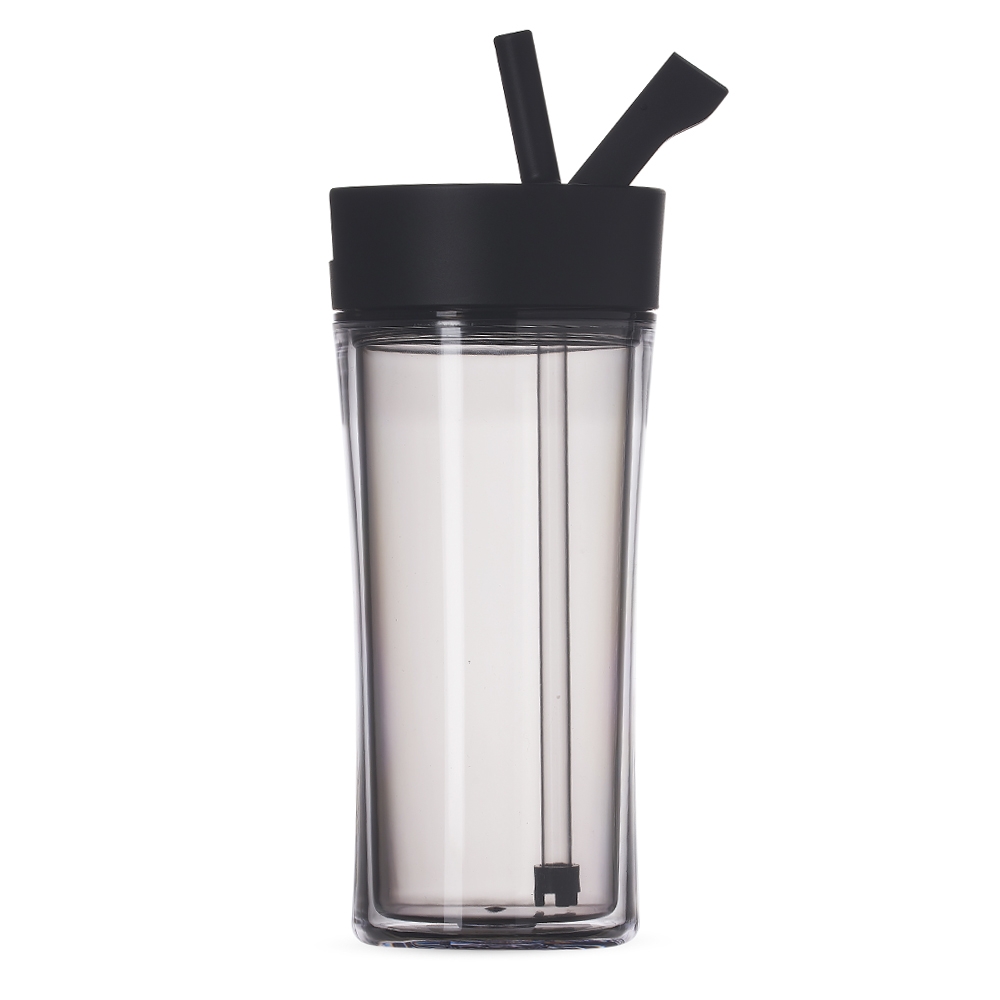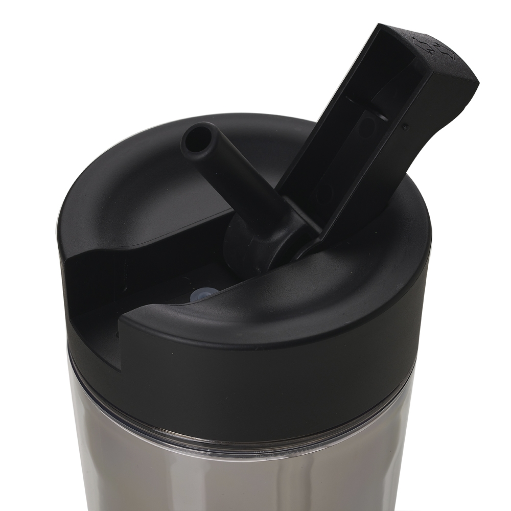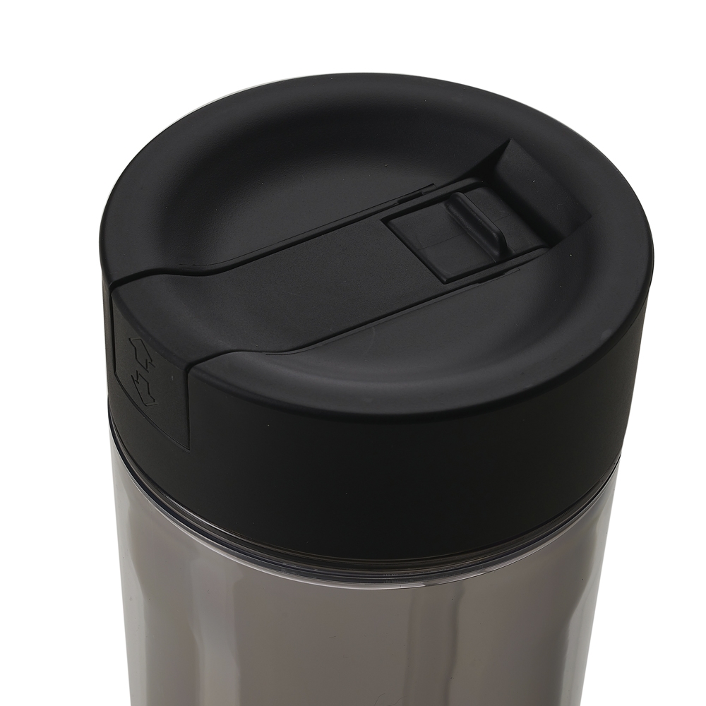 Copo plástico 500ml com tampa de bico. Material plástico cinza translúcido resistente e rígido, possui tampa rosqueável plástica na cor preta com suporte indicativo de abertura(seta para cima e para baixo), levantando o suporte irá acionado o bico de canudo.