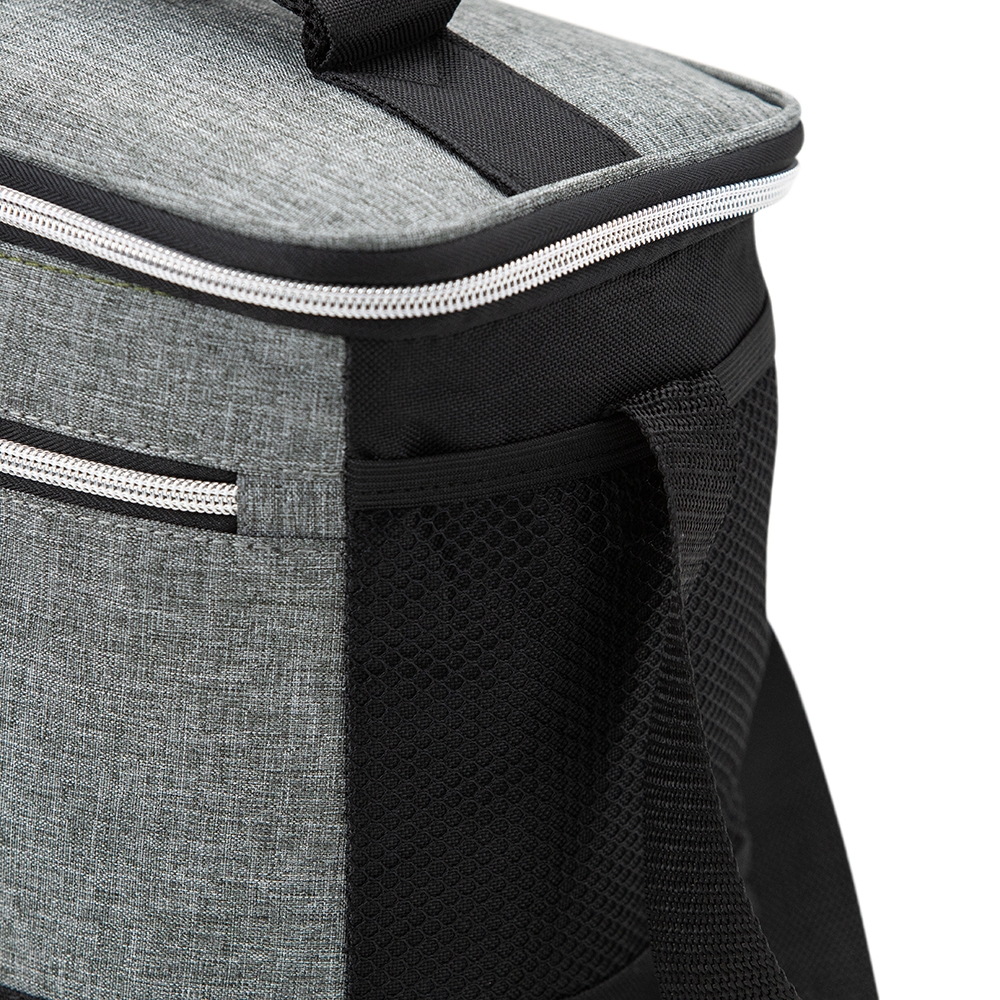 Bolsa térmica 10 litros com bolsos externos e alça de mão, contém bolso frontal com zíper, bolsos laterais telados e alça transversal regulável.
