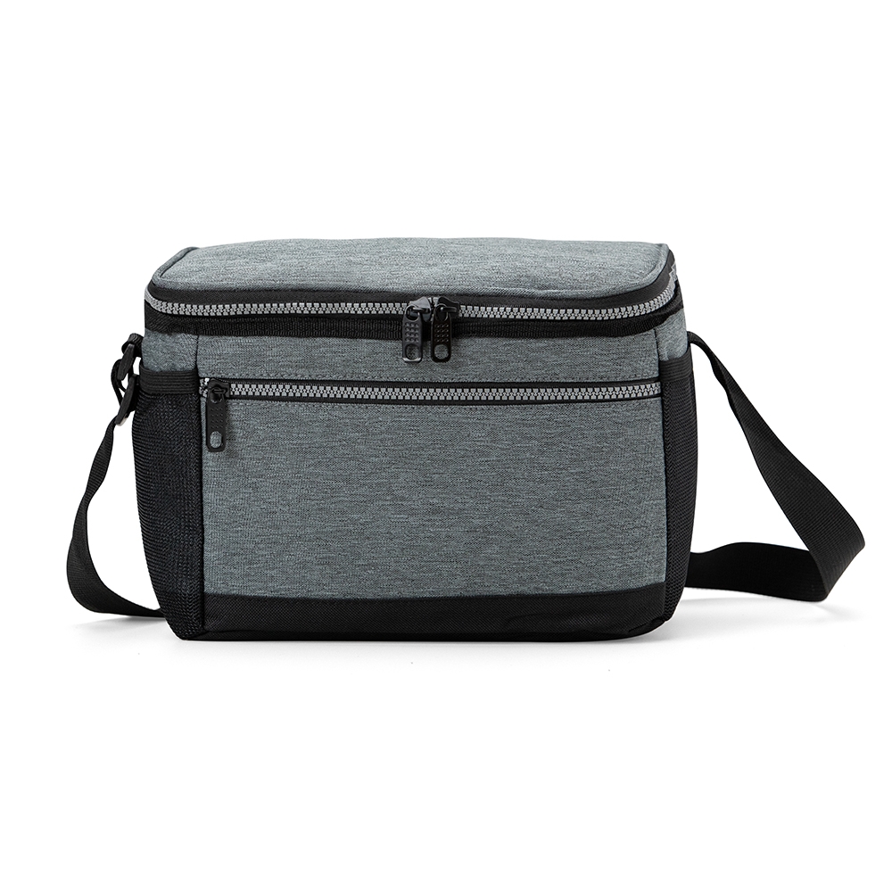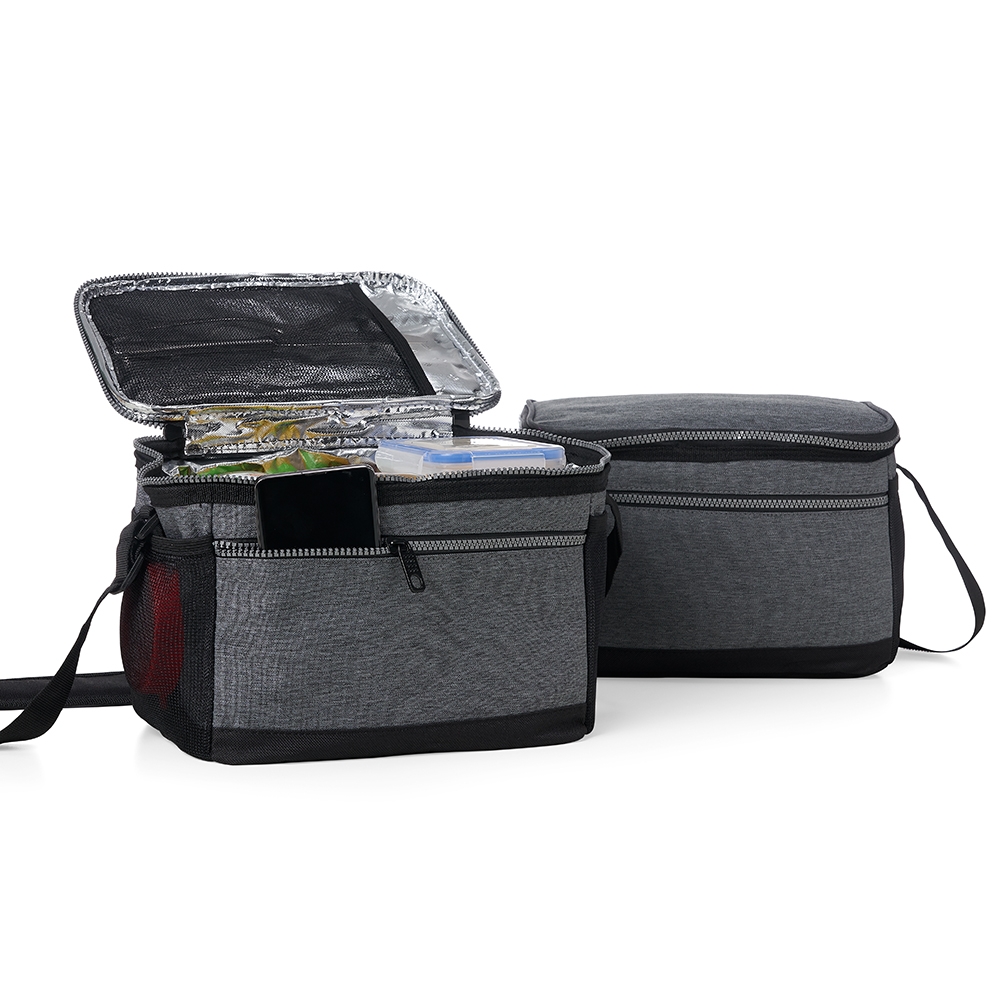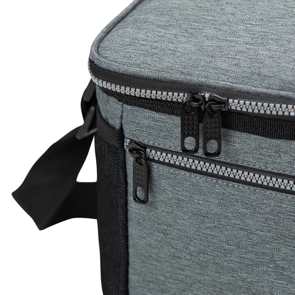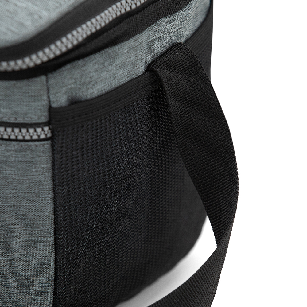 Descrição: Bolsa térmica 10 litros com bolsos externos, contém bolso frontal com zíper, bolsos laterais telados e alça transversal regulável com apoio para ombro.