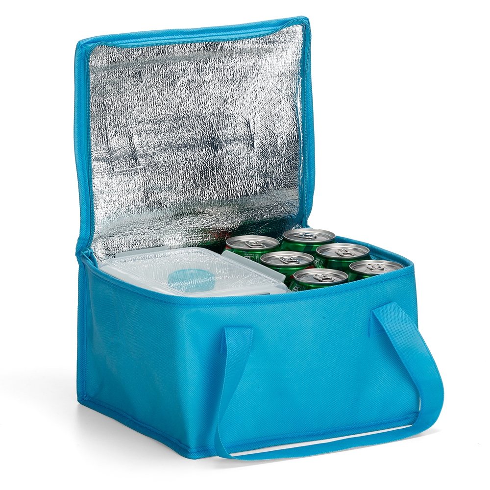 Bolsa térmica 10 litros em TNT com alça para mãos, revestimento interno de manta térmica.