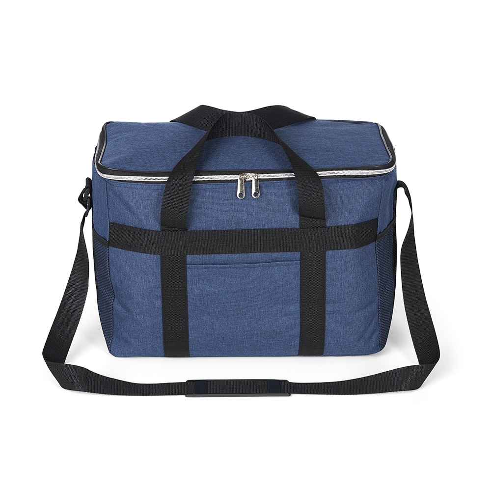 Bolsa térmica 33 litros. Contém bolso frontal, bolsos laterais telados, alça de mão em nylon e alça transversal regulável (não removível) com apoio para ombro.