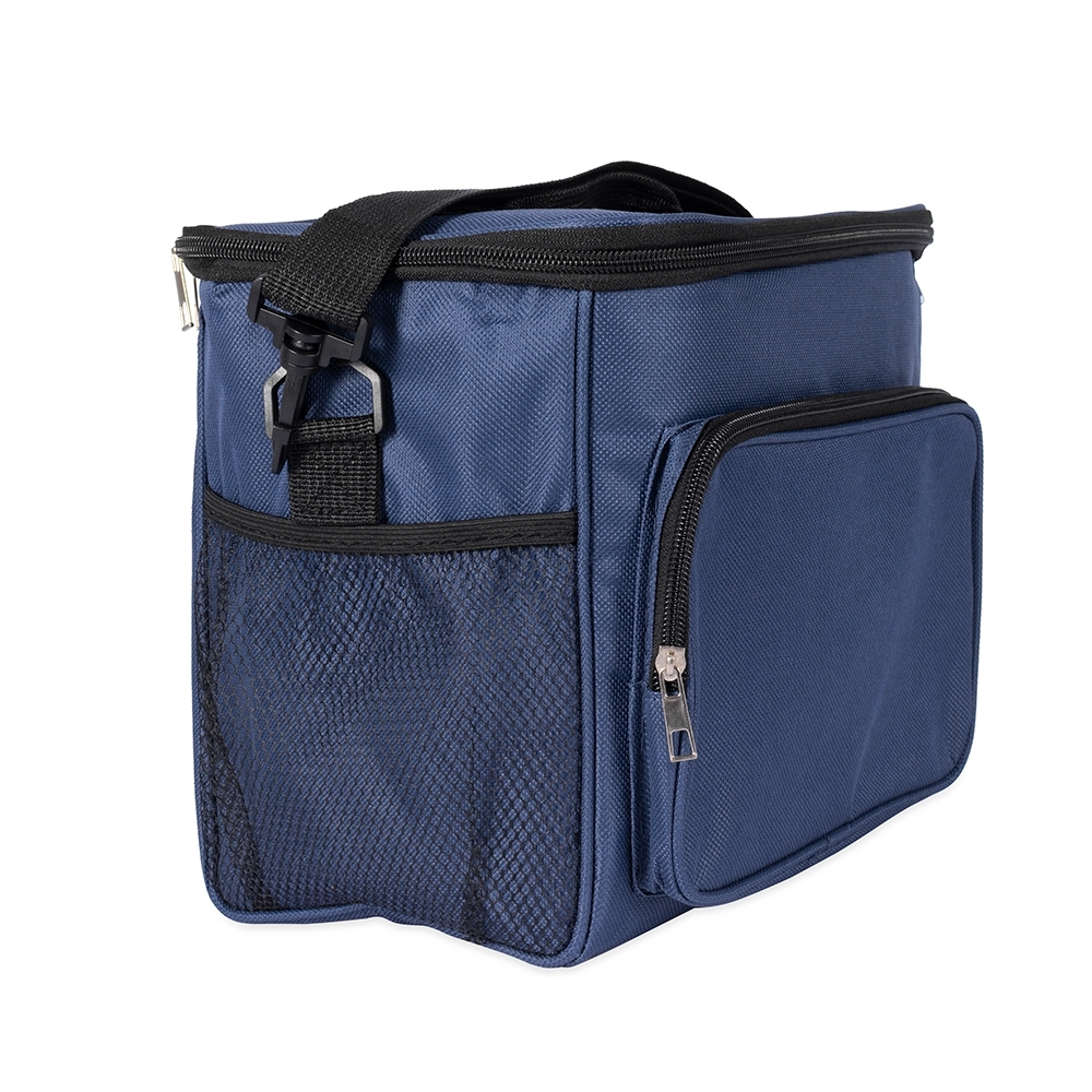 Descrição: Bolsa térmica em Oxford resistente à água e com capacidade de até 11 litros. Seu revestimento interno em alumínio permite a conservação de temperatura de alimentos e bebidas por mais tempo. Possui também um bolso frontal e mais um par de bolsos laterais em tela de nylon, além de uma alça fixa na tampa e outra transversal.