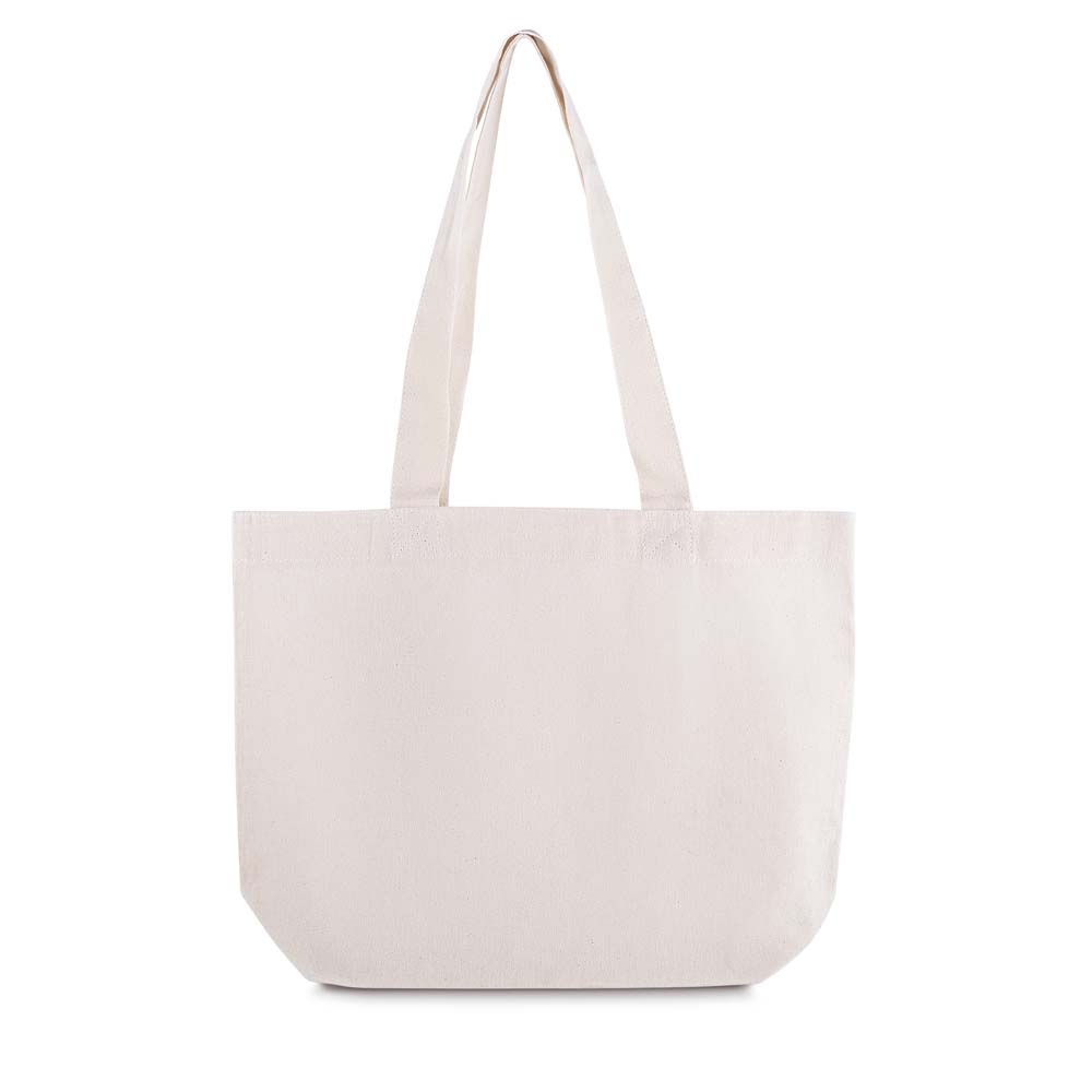 Sacola em Algodão Cru 120g/m²com base plana. Alça com altura de 23 cm, ideal para transporte.