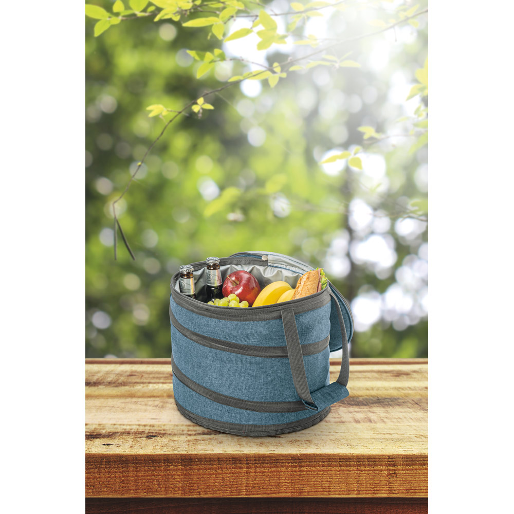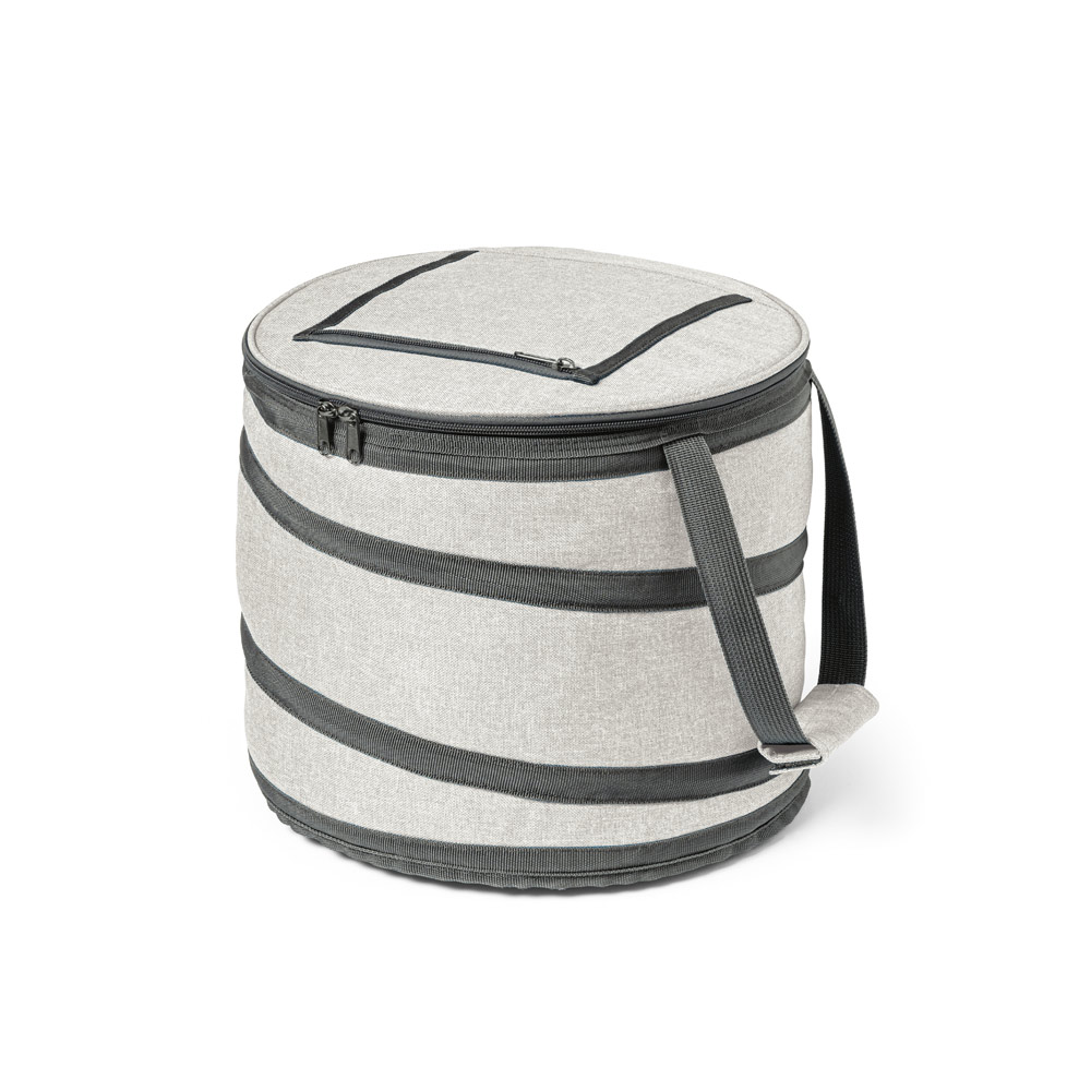 Sacola térmica flexível em 600D com zíper duplo, interior forrado com PEVA e abridor de garrafas. Bolso superior com zíper, alças em webbing, com reforço e capacidade até 15 L. Food grade. ø300 x 260 mm
