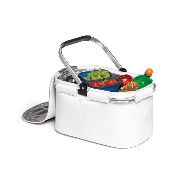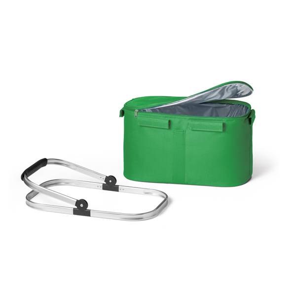 Sacola térmica flexível. 600D. Com zíper duplo e interior forrado. Estrutura removível em alumínio, com pega ergonómica em EVA. Capacidade até 14 L. Food grade. 260 x 250 x 270 mm