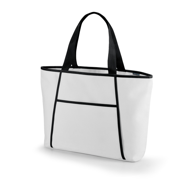 Sacola térmica. 600D. Fecha com zíper. Compartimento exterior aberto (forrado) com bolso frontal. Alças em webbing de 55 cm. Food grade. 470 x 305 x 120 mm
