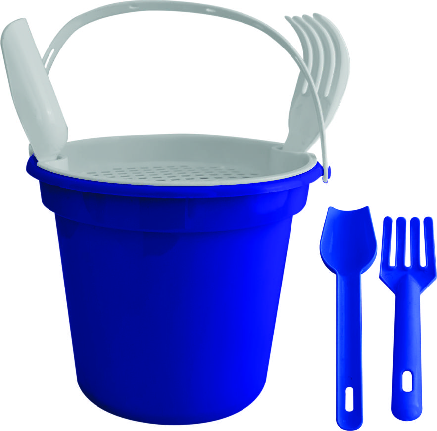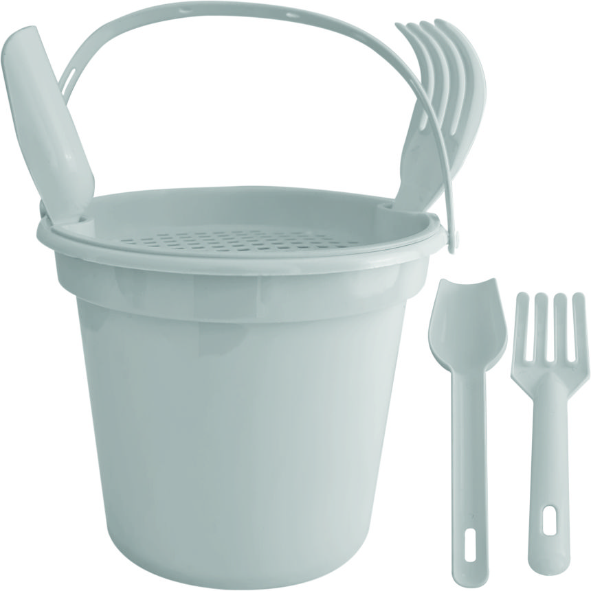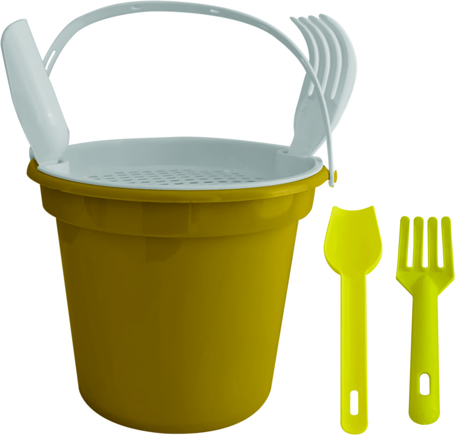 Matéria Prima: PP Polipropileno Dimensão: Boca 14 cm x Fundo 10 cm x Altura 12 cm Capacidade: 1 Litro Cores: Diversas Acompanha: Balde com alça, peneira, pá e rastelo. TIPO DE GRAVAÇÃO: Silkscreen & Transfer Embalado em saco plástico individual