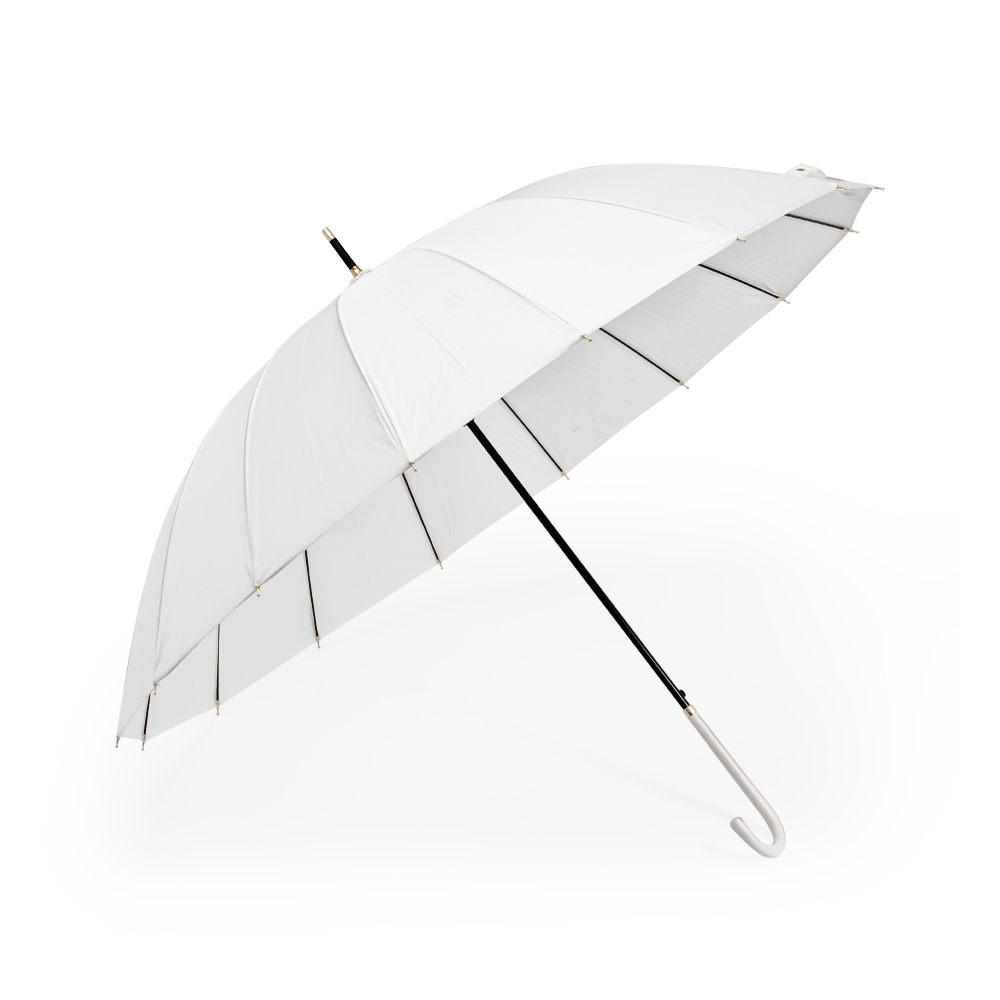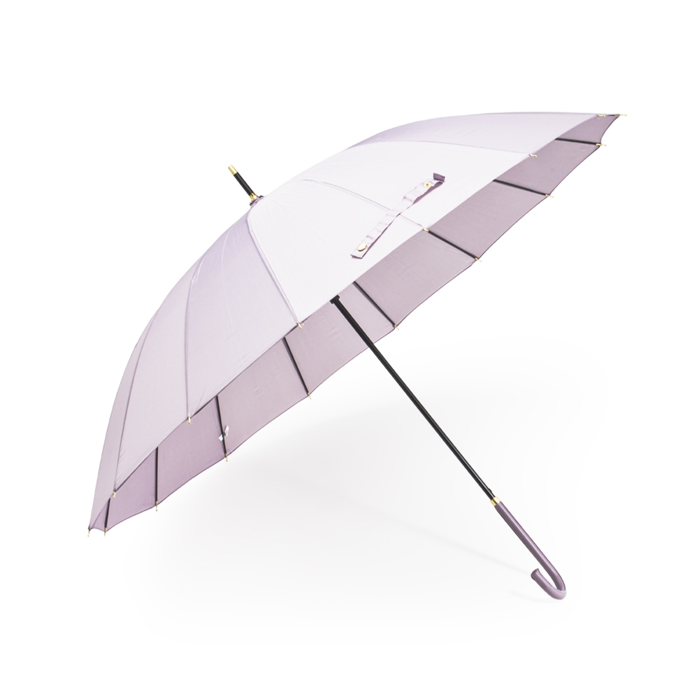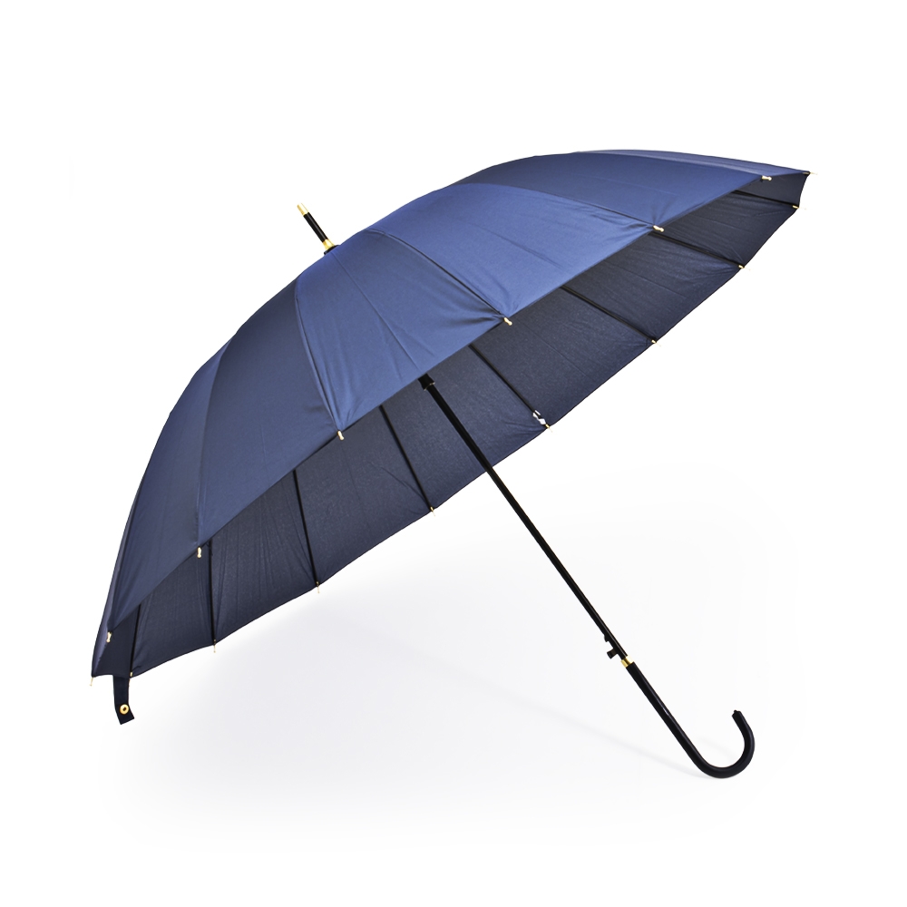 Descrição: Guarda-chuva de poliéster de impacto impermeável com abertura automátiva, estrutura em aço e 16 varetas em fibra de vidro. Possui pegador em material sintetico (imitação de couro) com botão de acionamento.