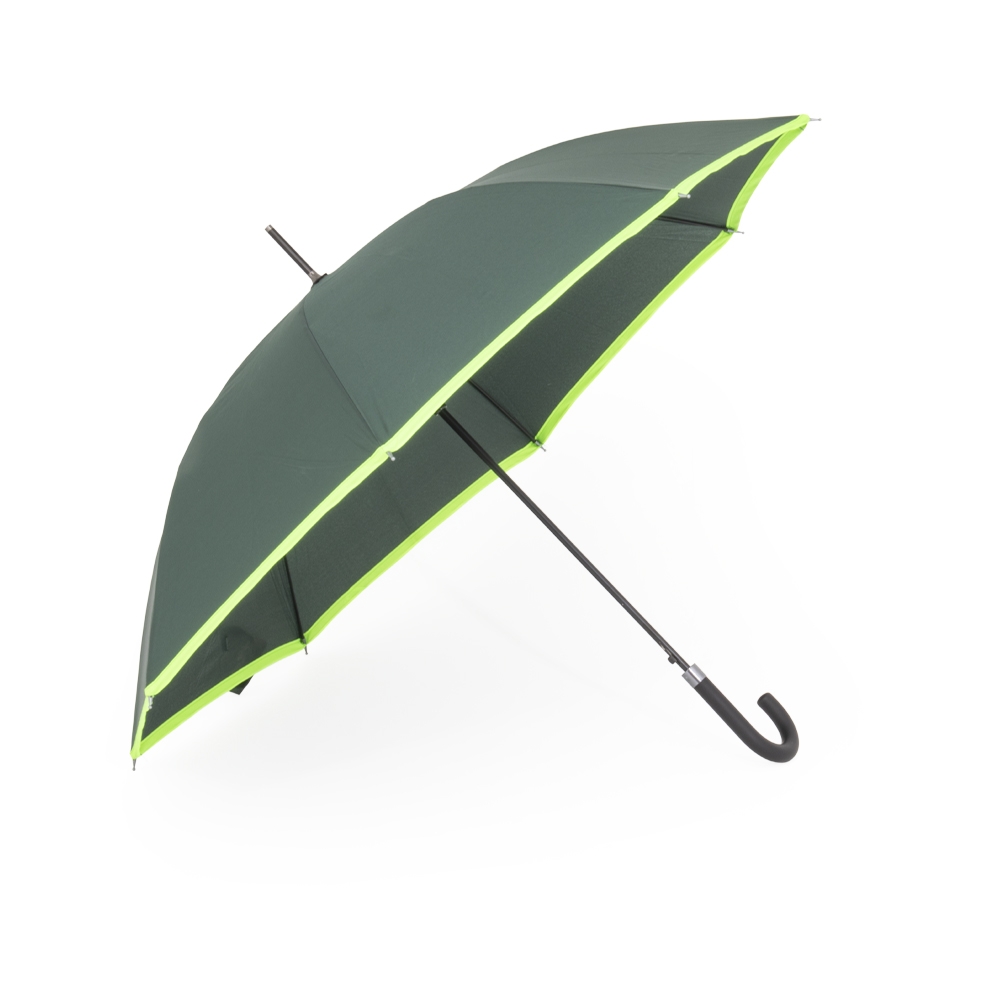Descrição: Guarda-chuva manual de poliéster com estrutura em aço e 8 varetas em fibra de vidro, possui pegador plástico com botão de acionamento.