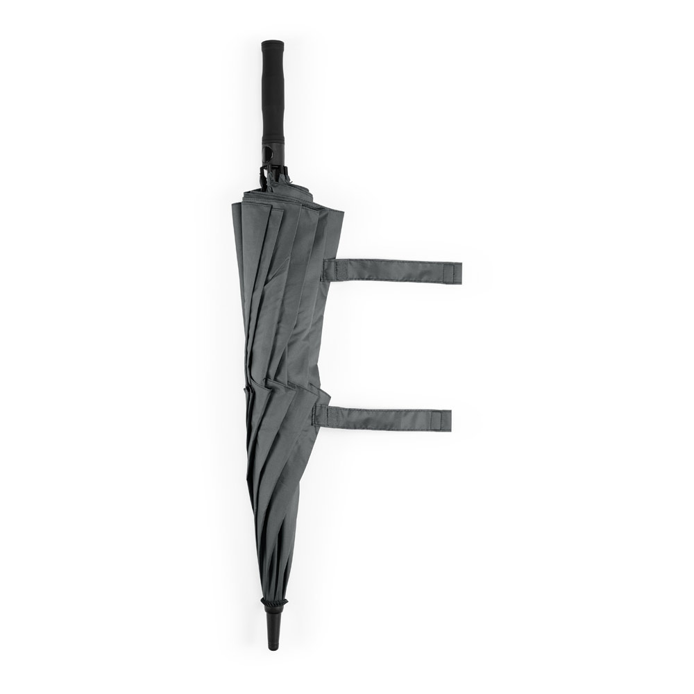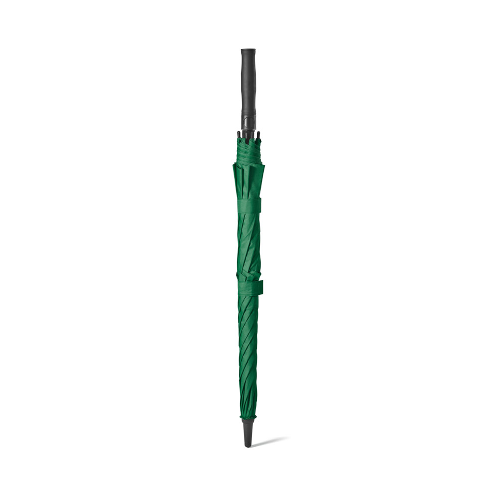 Guarda-chuva em 100% poliéster reciclado 190T (100% rPET), com varetas em fibra de vidro e pega em ABS reciclado. Guarda-chuva com abertura automática e à prova de vento. Fornecido em bolsa de poliéster reciclado. ø1055 x 840 mm