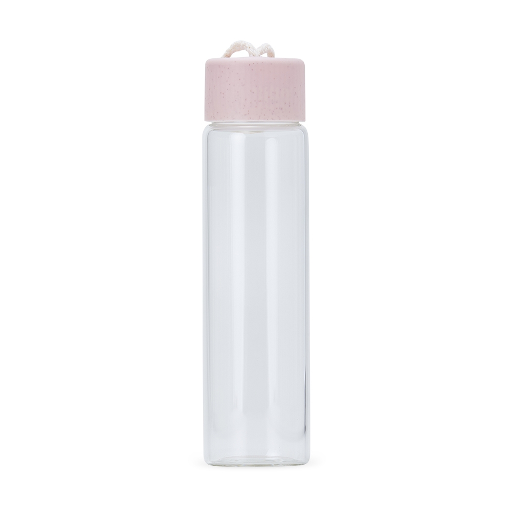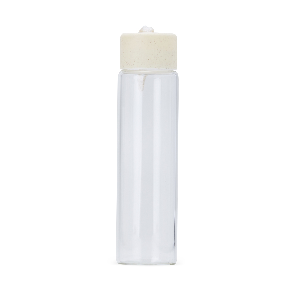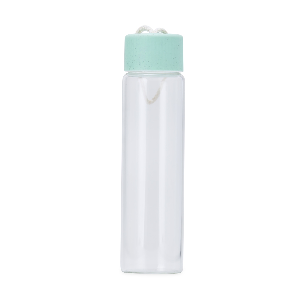 Descrição: Garrafa de vidro 330ml com tampa plástica e alça de algodão para transporte.