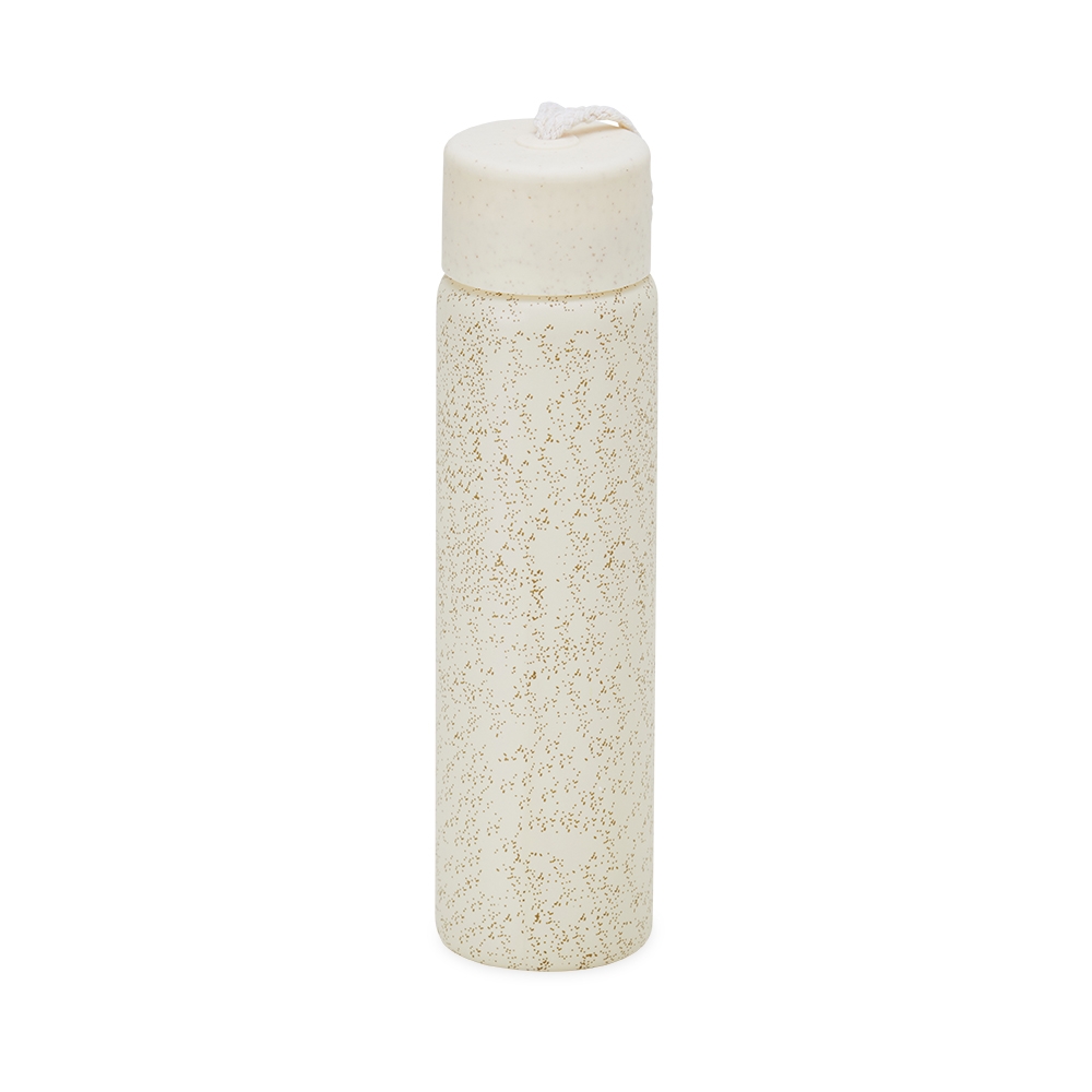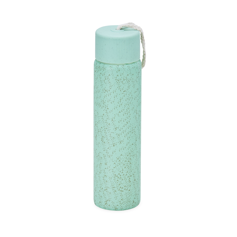 Descrição: Garrafa de vidro 330ml com acabamento adesivado, tampa plástica e alça de algodão para transporte.