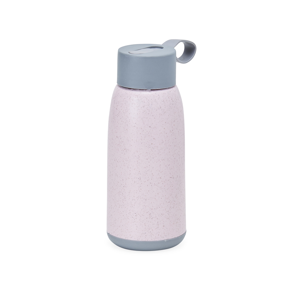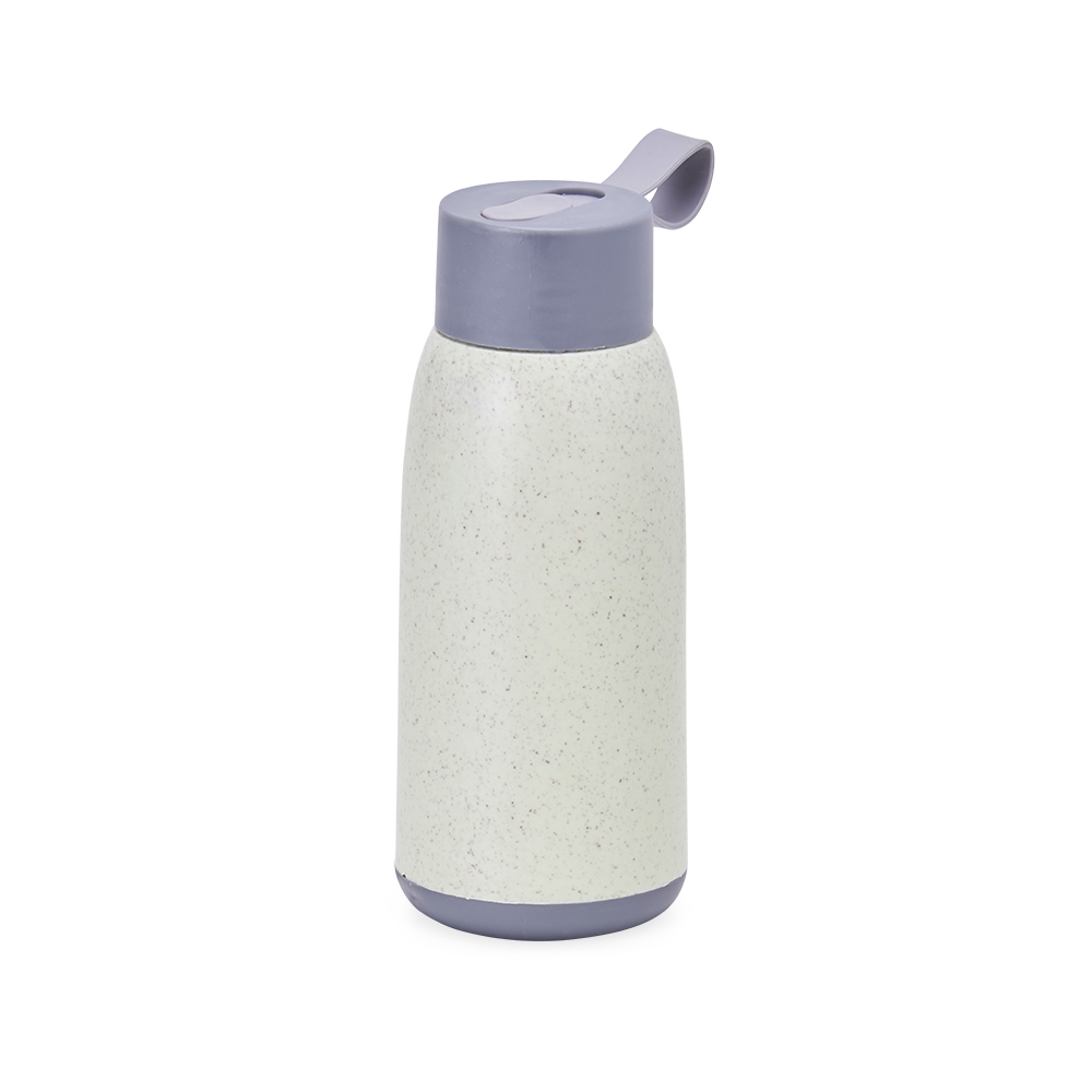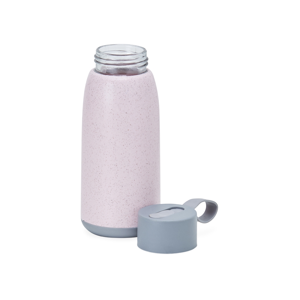 Descrição: Garrafa de vidro 350ml com revestimento plástico, tampa plástica com alça de silicone.