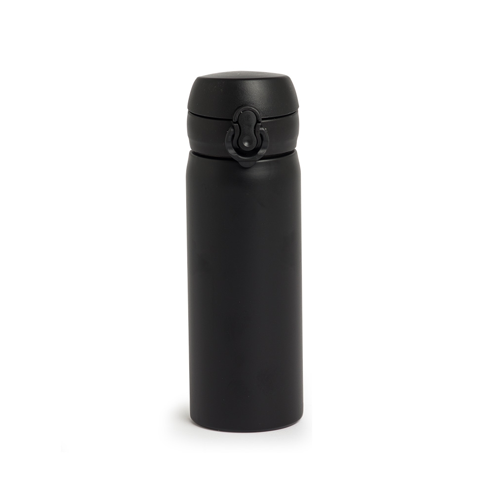 Descrição: Garrafa 500ml em inox com botão e válvula para abertura. Possui um sistema de trava (basta mover para cima/baixo para abrir/fechar) pressione o botão central para abrir a tampa.