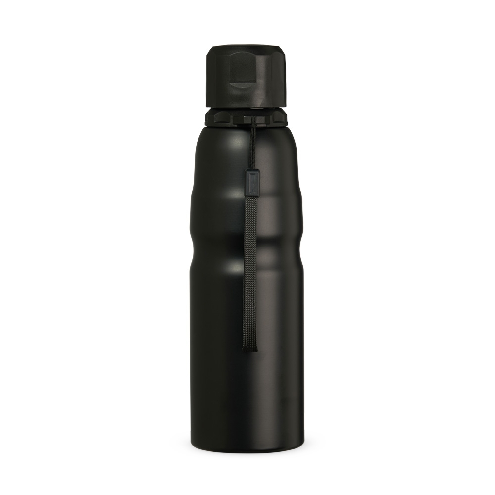 Descrição: Garrafa inox 800ml com tampa plástica rosqueável e cordão para transporte.