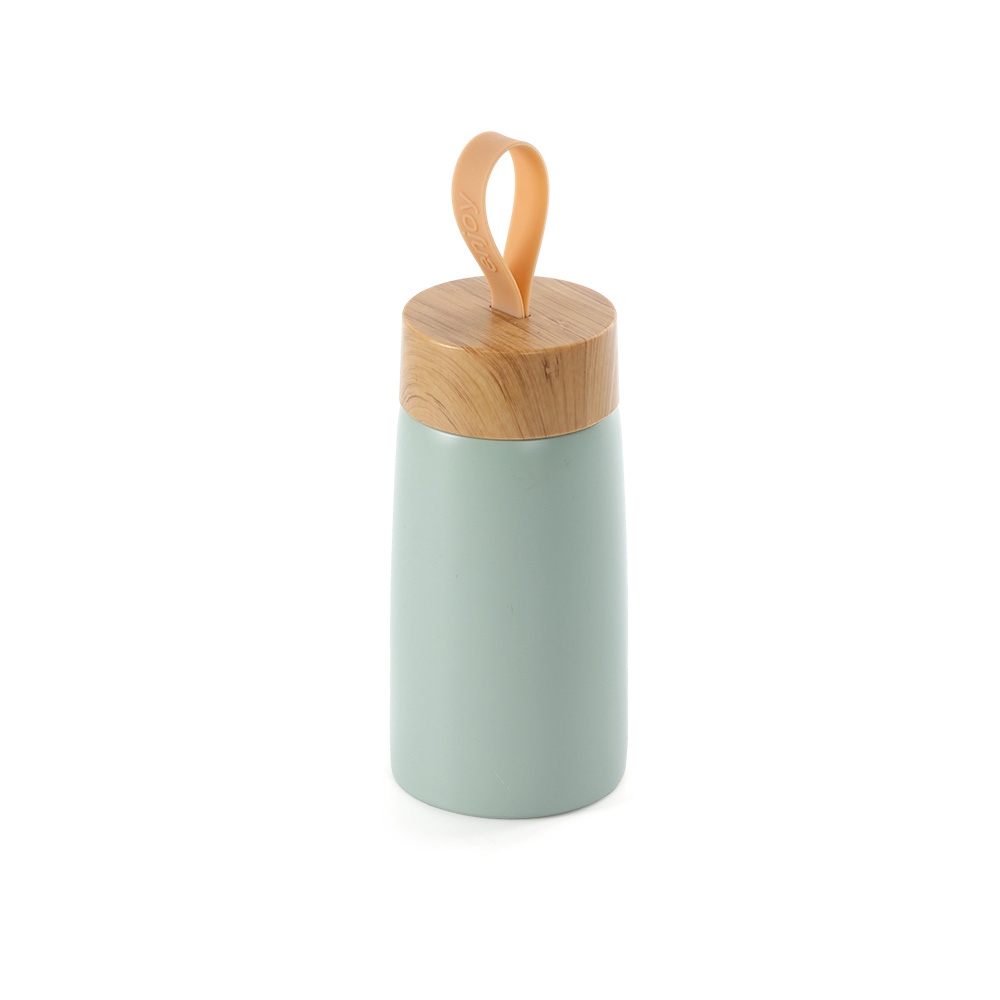 Descrição: Garrafa inox 304 com parede dupla, capacidade de 250ml. Contém tampa plástica com design de bambu e alça de silicone para transporte.