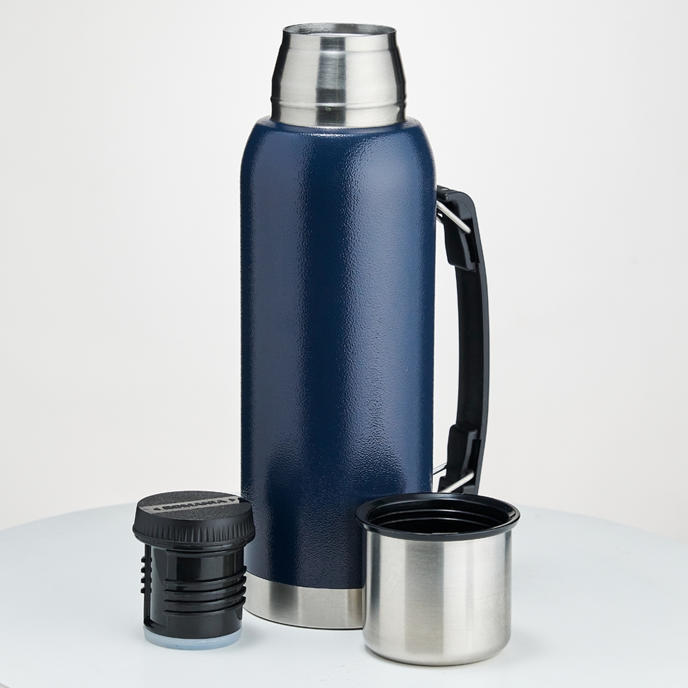 Descrição: Garrafa térmica de inox livre de BPA com capacidade de 1 litro. Contém alça para transporte e pintura texturizada.