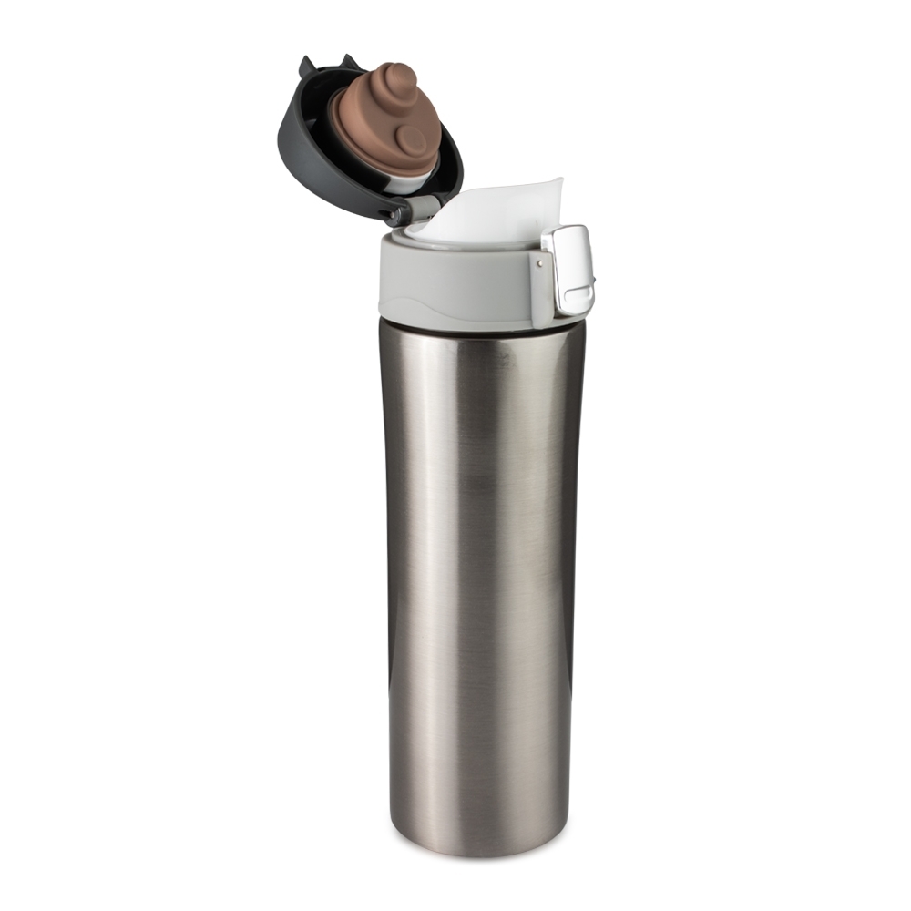 Descrição: Garrafa térmica de 450ml, prática e segura! Feita em inox 304, com parede dupla que mantém a temperatura do líquido por mais tempo. Sua tampa plástica fosca possui vedação em borracha para evitar vazamentos e garantir proteção extra. Com botão central para abertura e trava lateral intuitiva, basta seguir os ícones de cadeado para travar ou destravar a tampa com facilidade. Sinônimo de segurança e agilidade na hora de consumir bebidas!