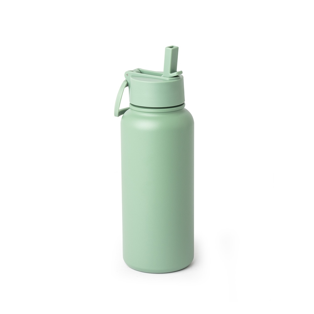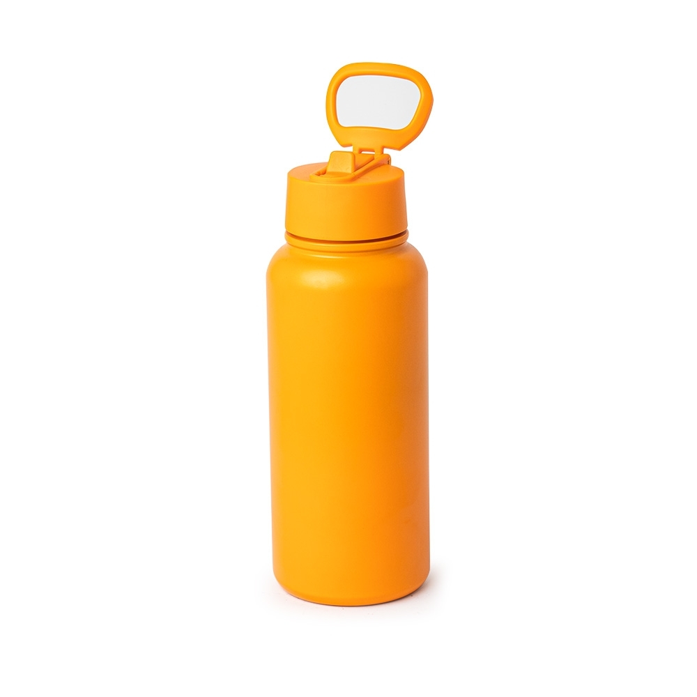 Descrição: Garrafa térmica de parede dupla em inox, capacidade de 900ml. Tampa rosqueável com alça de transporte, bico flip e canudo interno.