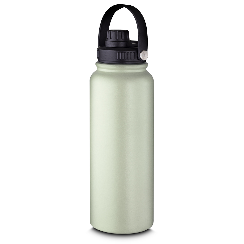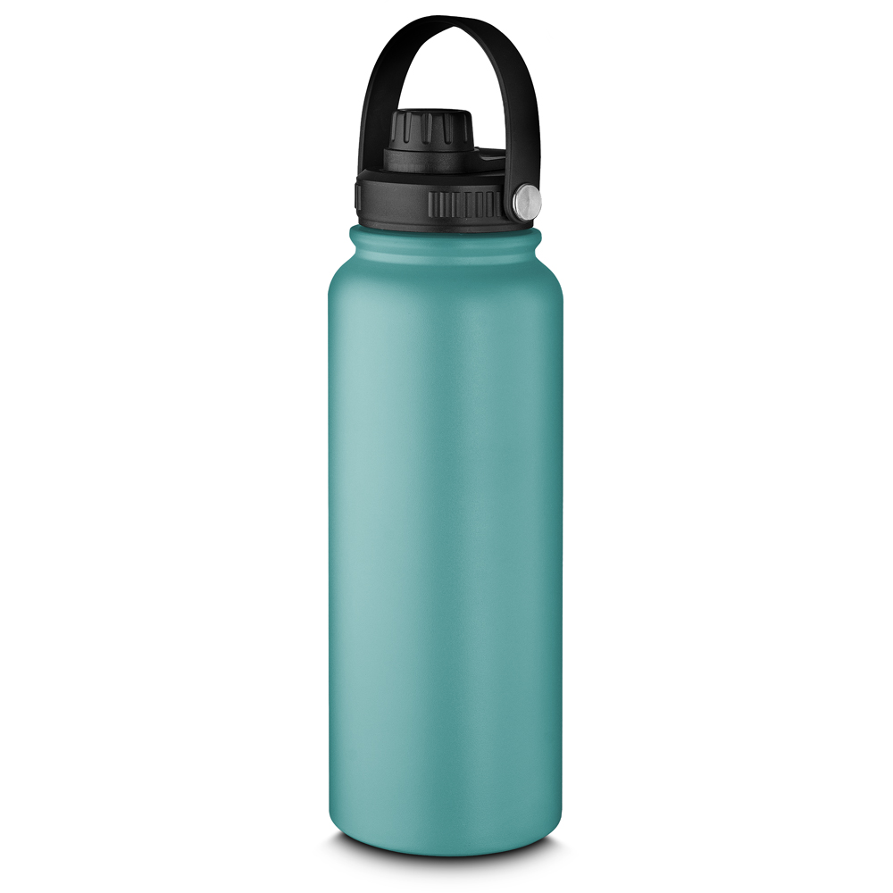 Garrafa térmica em aço inox com parede dupla com capacidade de 1,1L, tampa rosqueável com alça plástica, tampa rosqueável com e anel de silicone para vedação para se hidratar.