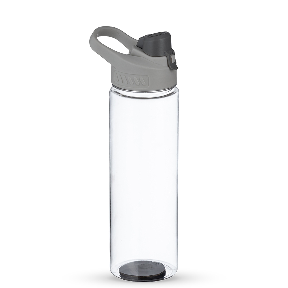 Squeeze plástico 700ml com alça para transporte, possui tampa principal rosqueável e tampa de proteção plástica com trava para o bocal.