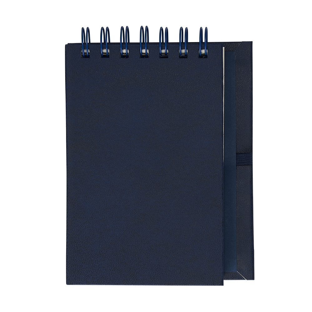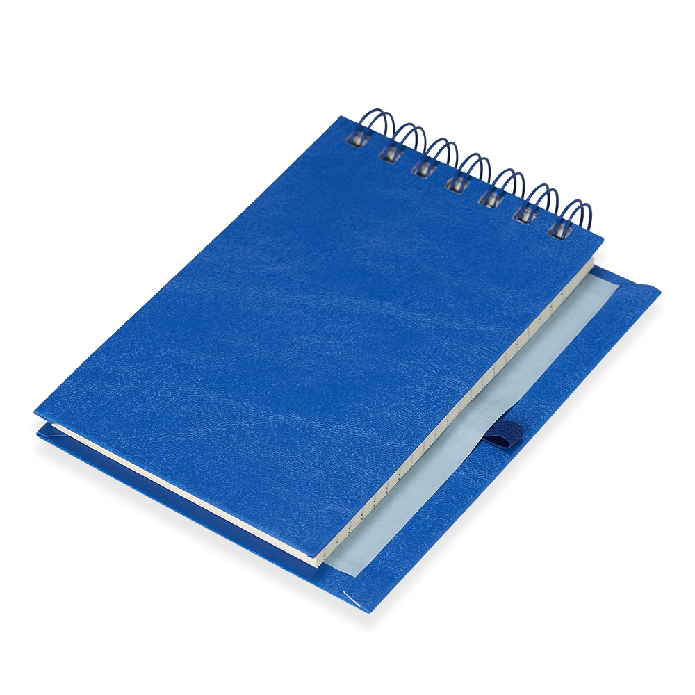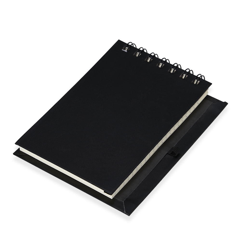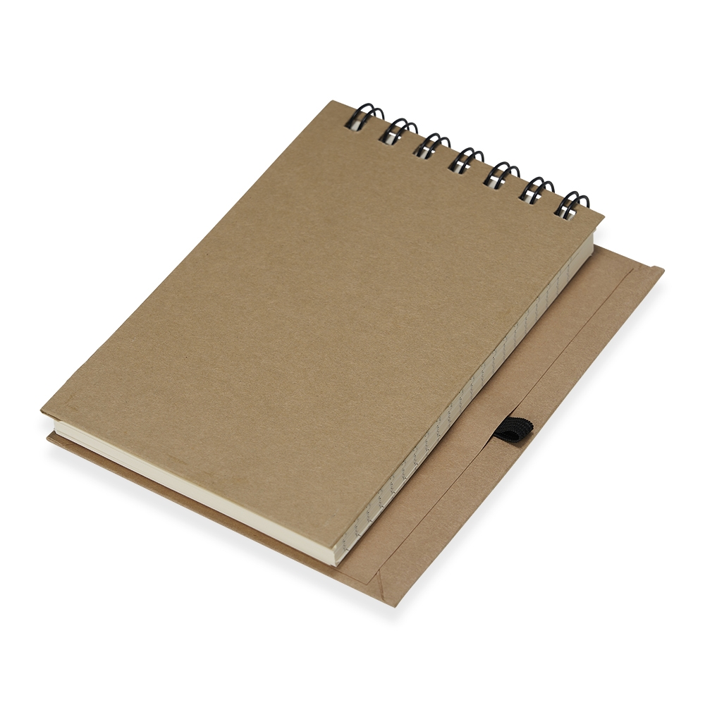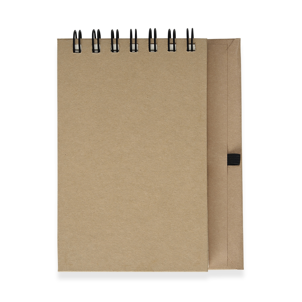 Descrição: Bloco de anotação em material sintetico (imitação de couro) com porta caneta e wire-o. Possui aproximadamente 100 folhas com frente pautada. Obs.: Exclusivamente a cor kraft é capa é produzida em papel kraft.