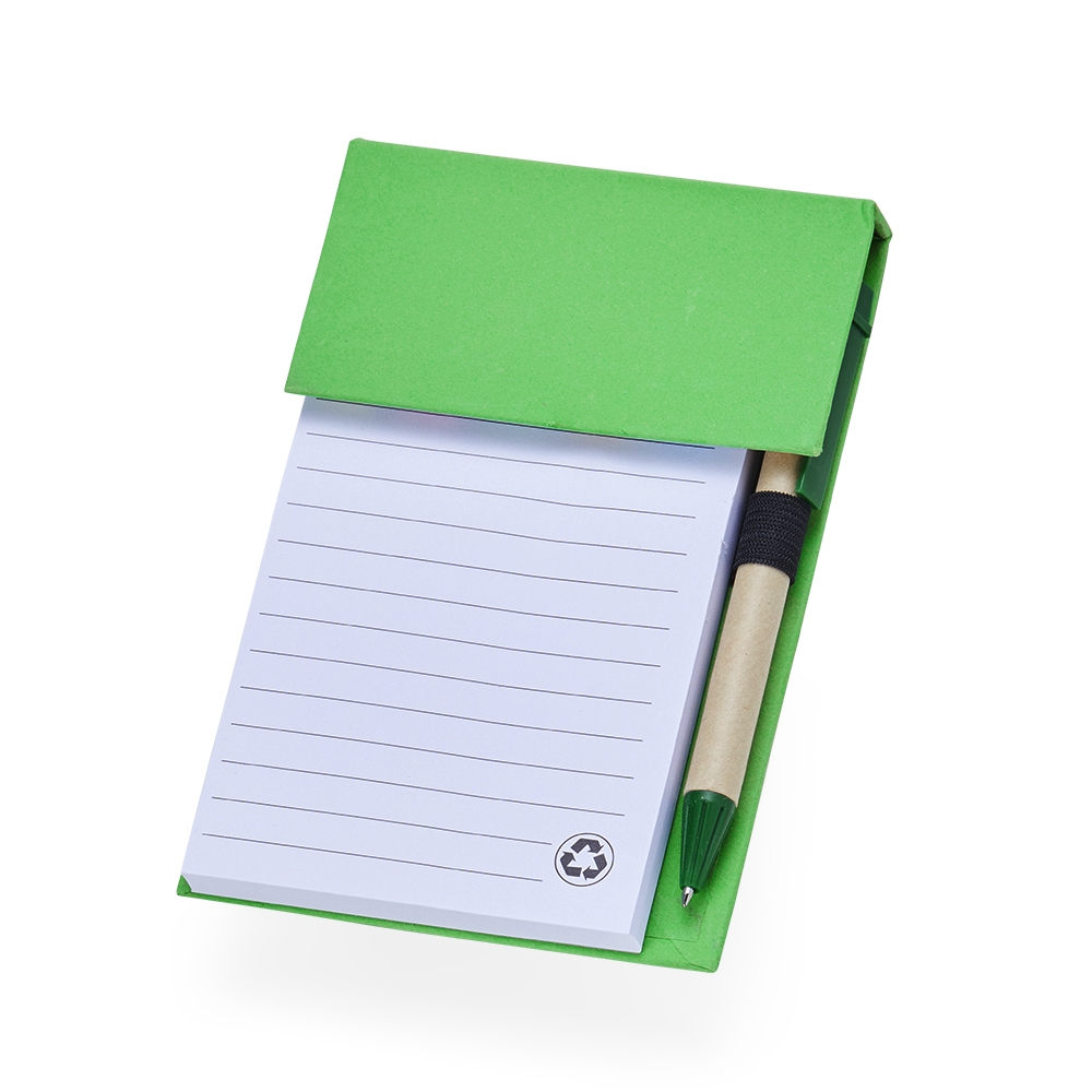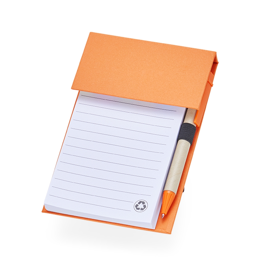Descrição: Bloco de anotações ecológico com caneta, feito em kraft com 6 blocos autoadesivos coloridos com aproximadamente 20 folhas e bloco com aproximadamente 100 folhas brancas com pauta. Possui porta caneta elástico e acompanha caneta de papelão e detalhes plásticos, carga esferográfica azul 1.0mm e acionamento por clique.