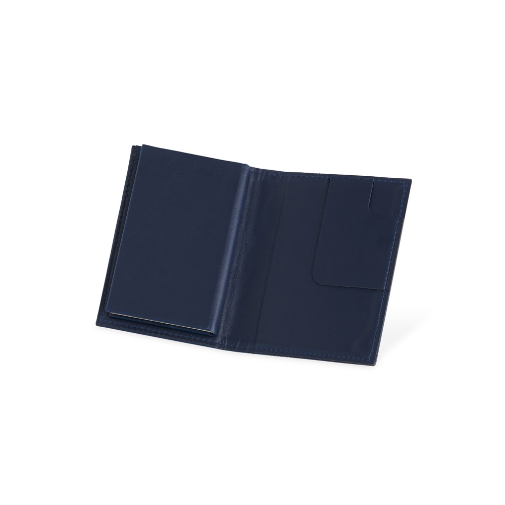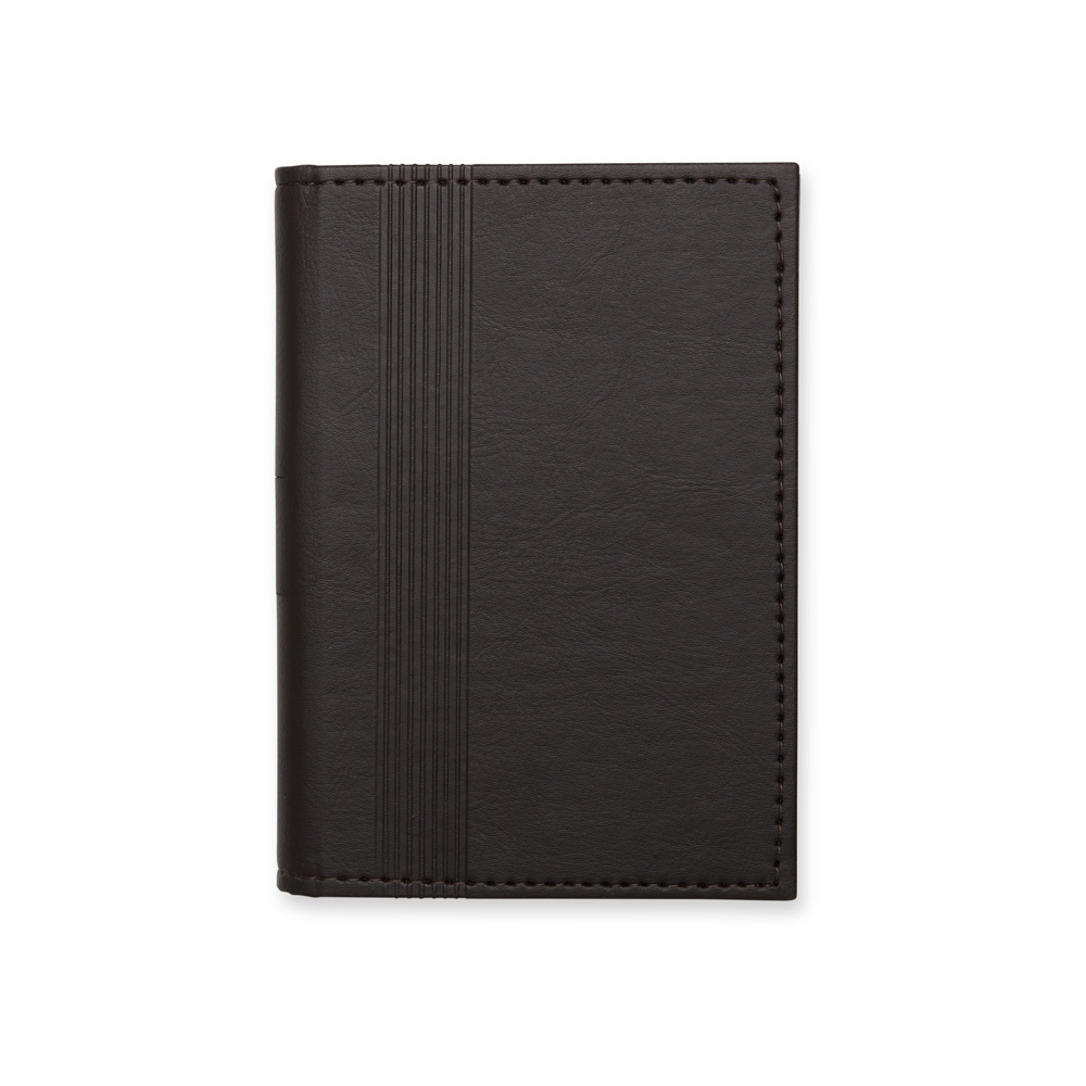 Descrição: Bloco de anotações em material sintetico (imitação de couro) com porta caneta e compartimento para arquivar folhas. Possui aproximadamente 80 folhas marfim sem pauta.