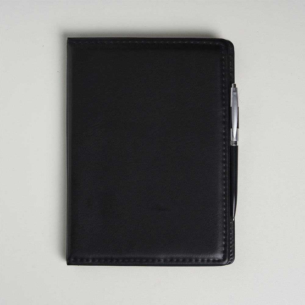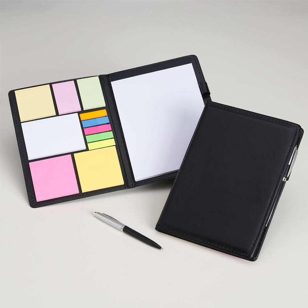 Descrição: Kit para anotações em material sintetico (imitação de couro) com autoadesivos e caneta plástica. Contém seis blocos com aproximadamente 50 folhas, conjunto de cinco marcadores plásticos autoadesivos com aproximadamente 26 folhas, bloco A5 com aproximadamente 50 folhas e caneta esferográfica com carga azul e acionamento por clique.