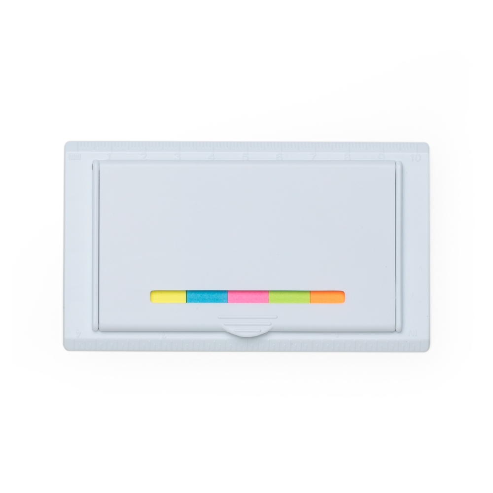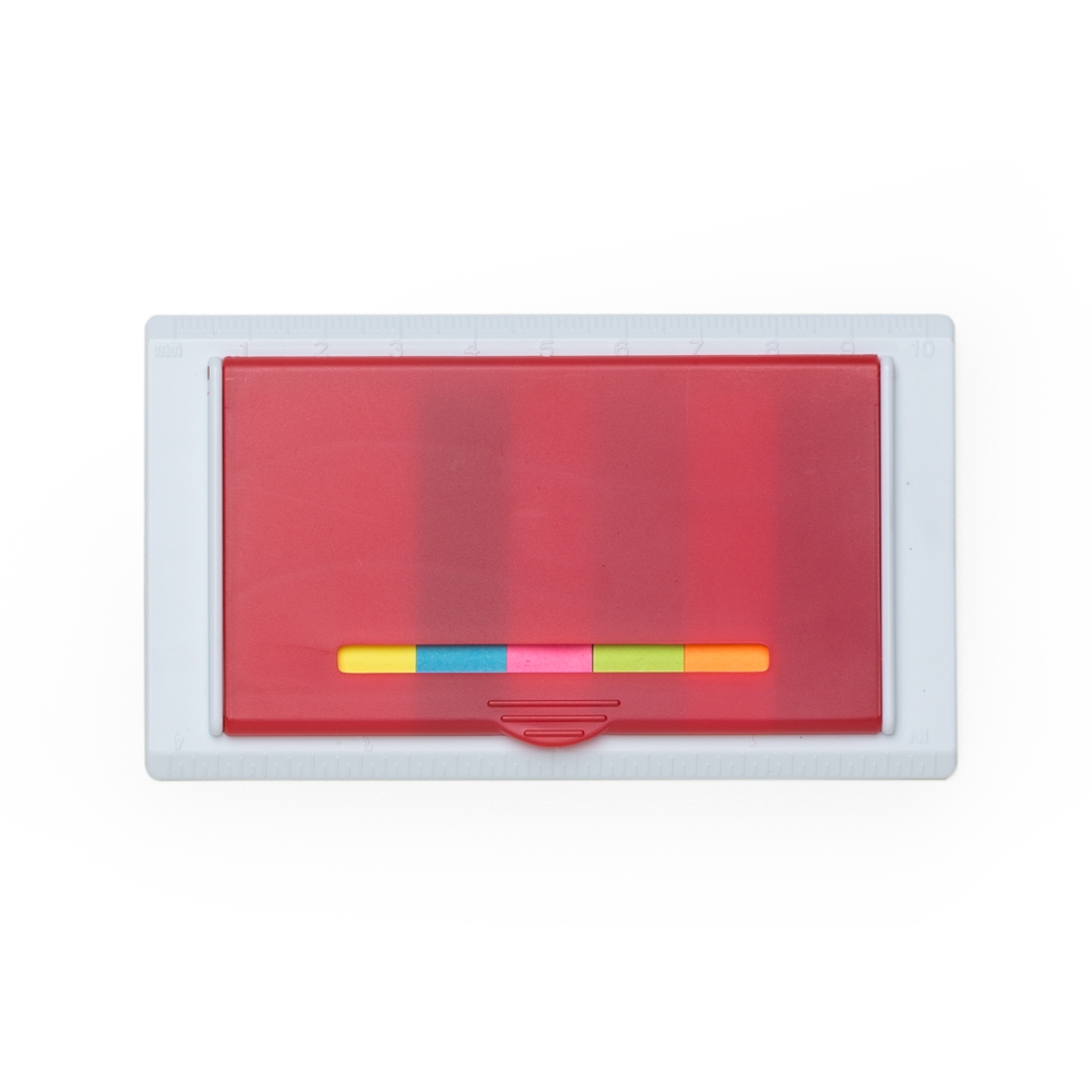 Kit post-it em plástico resistente, possui mini régua nas laterais maiores com as medidas em milímetro e polegada. Contém sete blocos auto-colantes com aproximadamente 25 folhinhas cada.