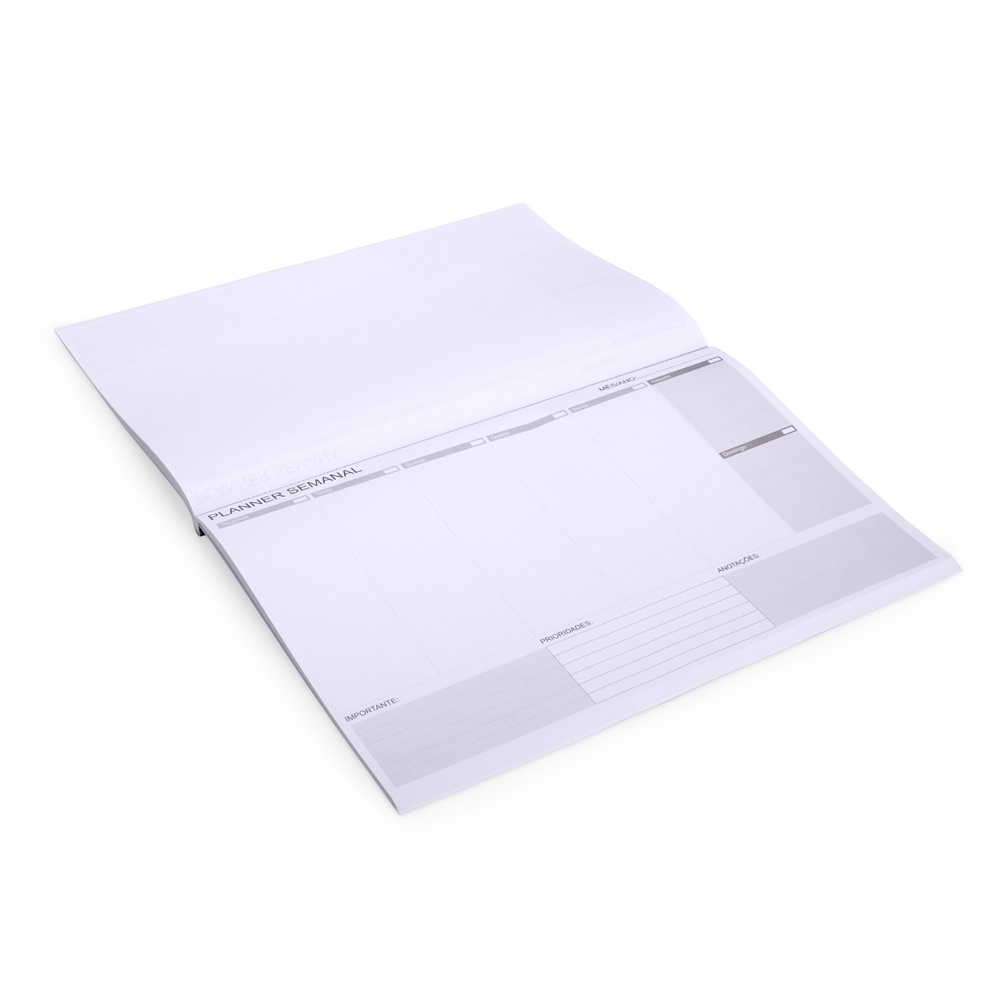 Descrição: Planner semanal com cerca de 55 folhas destacáveis para anotações e organização ao longo da semana.