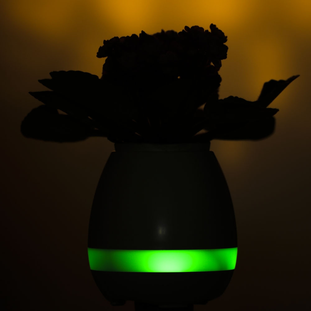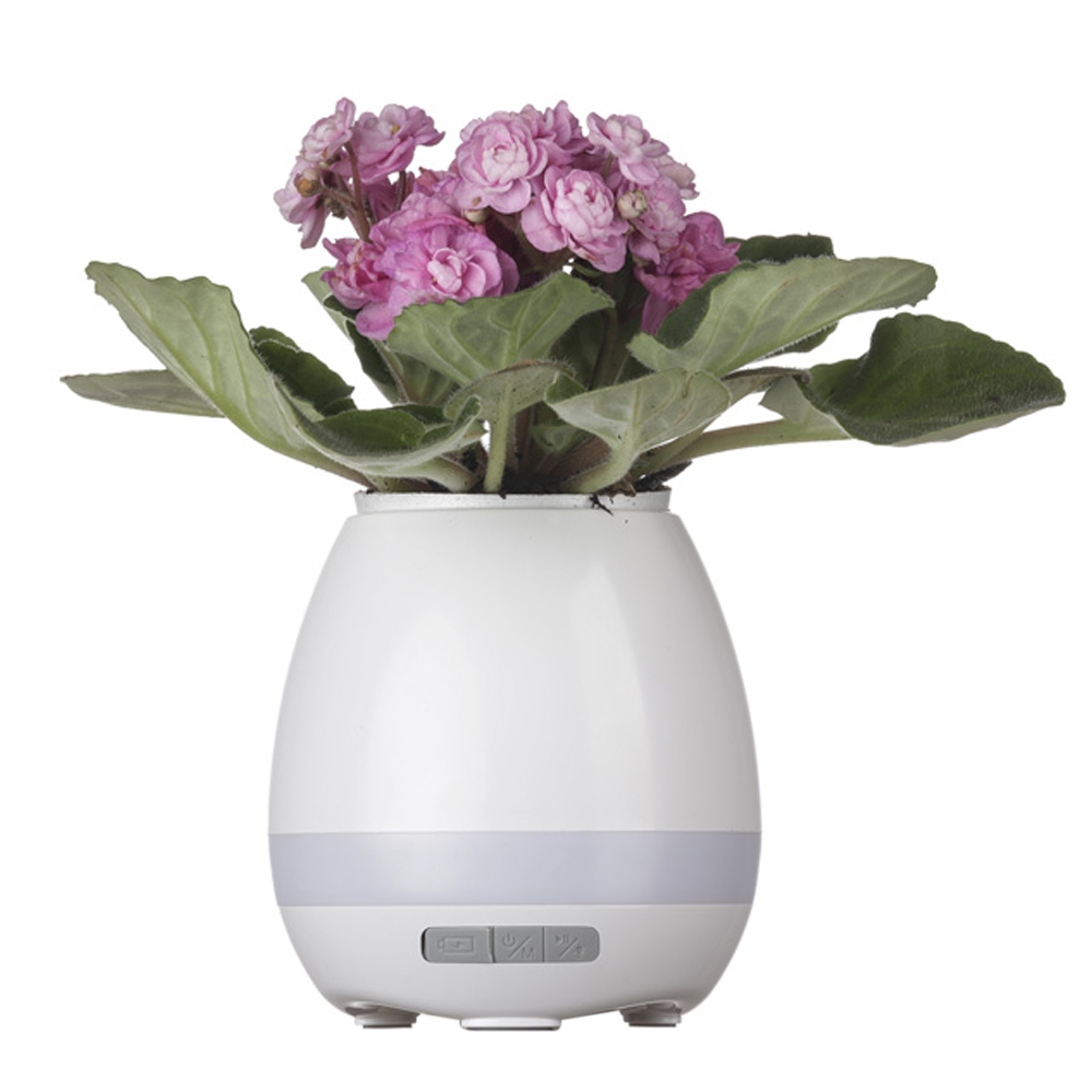 Vaso de planta musical com bluetooth e sensor de toque. Material plástico resistente, possui haste de alumínio interna com sensor de toque, buraco interno para escoamento da água, parte inferior com borrachas antideslizantes, auto falante, luz led inferior, botões Power/Mode e Play/Pause Luzes, entrada USB. Funções: botão Power/Mode ao segurar irá ligar/desligar o vaso, quando ligado ao pressionar o mesmo botão irá alternar entre os modos Bluetooth ou Piano; botão Play/Pause ao pressioná-lo no modo Piano ele irá alterar os toques musicais(possui toques pré-definidos), no modo Bluetooth ao pressioná-lo irá ligar/desligar as luzes led. Quando o vaso estiver desligado, segure este botão e uma luz verde piscará duas vezes indicando o acionamento do modo abajur, na primeira fase(ao tocar a planta ou o sensor) irá acionar uma luz amarela, na segunda fase(toque novamente a planta ou o sensor) irá alternar um conjunto de cores. Para desligar segure o botão e uma luz vermelha piscará duas vezes indicando o desligamento. Falante 5W3Ω; Sinal Ruído 90dB; Frequência de Resposta 20~20KHz; Alcance do Bluetooth 10 metros; Bateria 1200mAh; Voltagem 3.7V; Parâmetro de Voltagem 5V 500mA; Tempo aproximado de carga 4 horas; acompanha manual em Chinês/Inglês e cabo USB. Para que o produto tenha uma maior durabilidade, recomenda-se que a planta não seja tóxica. NÃO ACOMPANHA PLANTA, IMAGEM MERAMENTE ILUSTRATIVA.