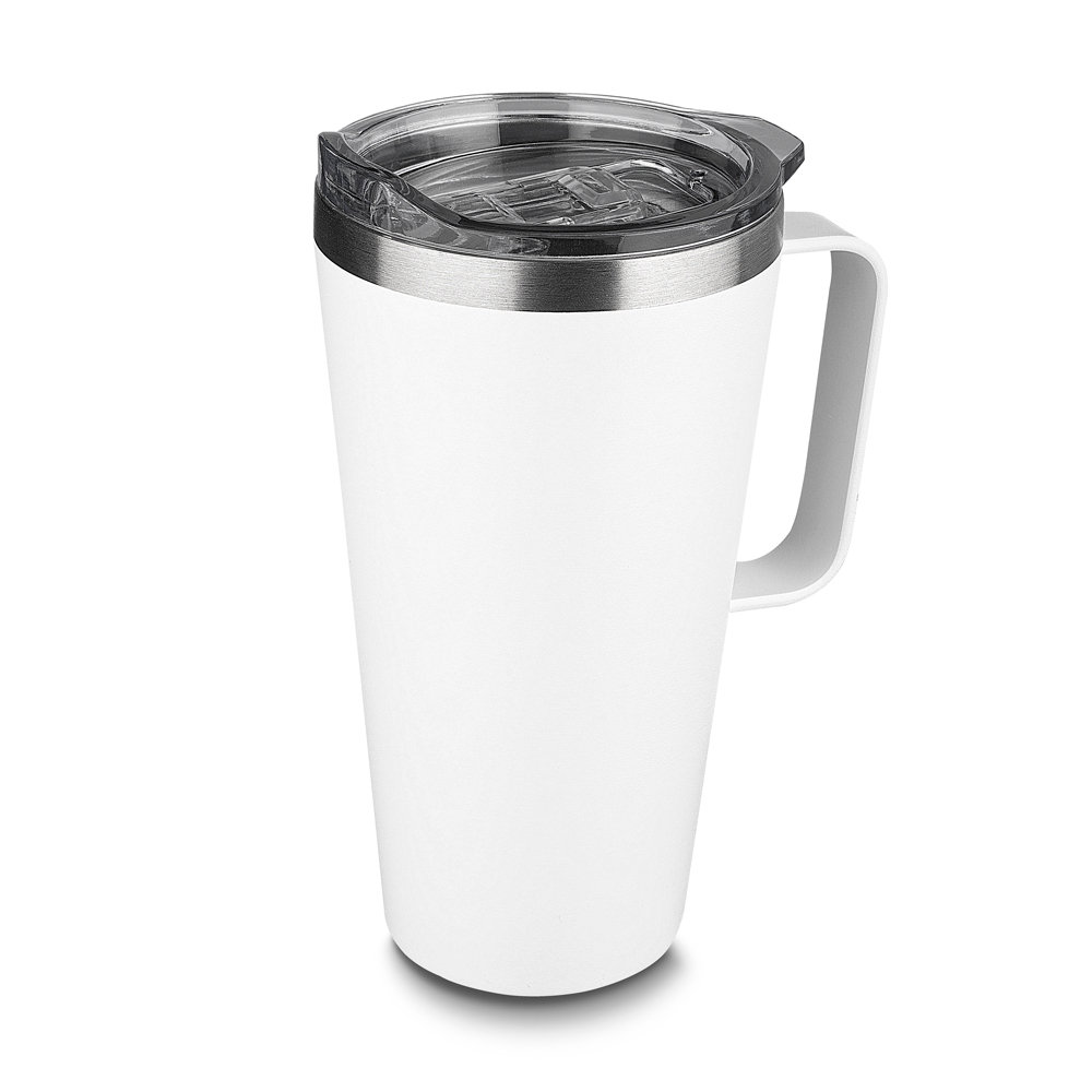 Caneca térmica em aço inox com parede dupla isolada à vácuo, tampa plástica e anel em silicone para vedação, alça lateral. Capacidade 530ml.